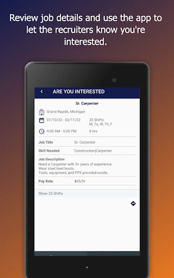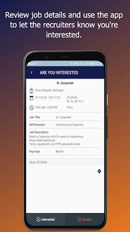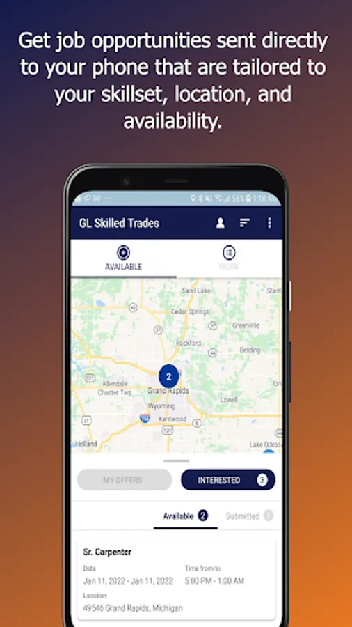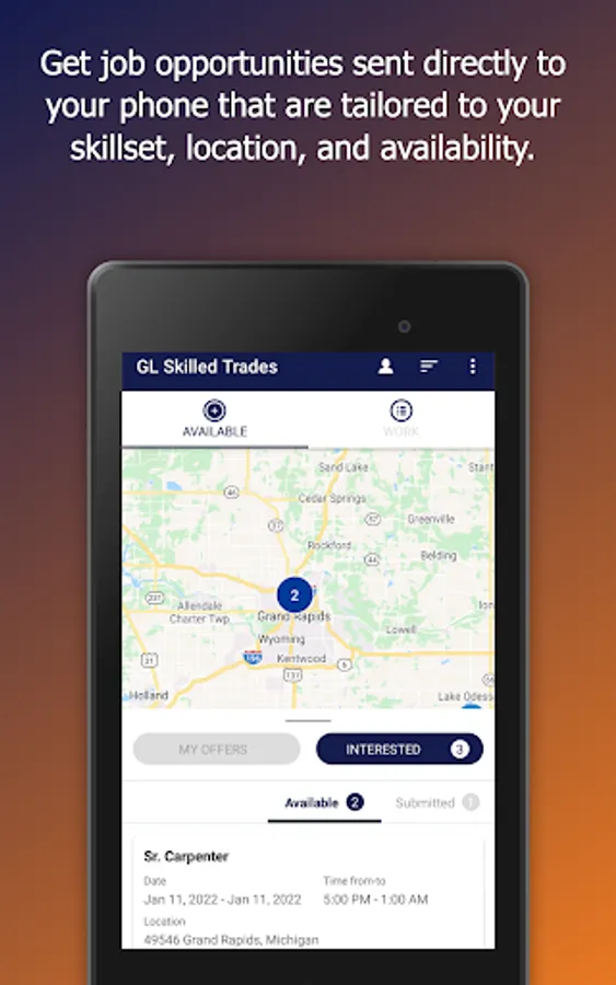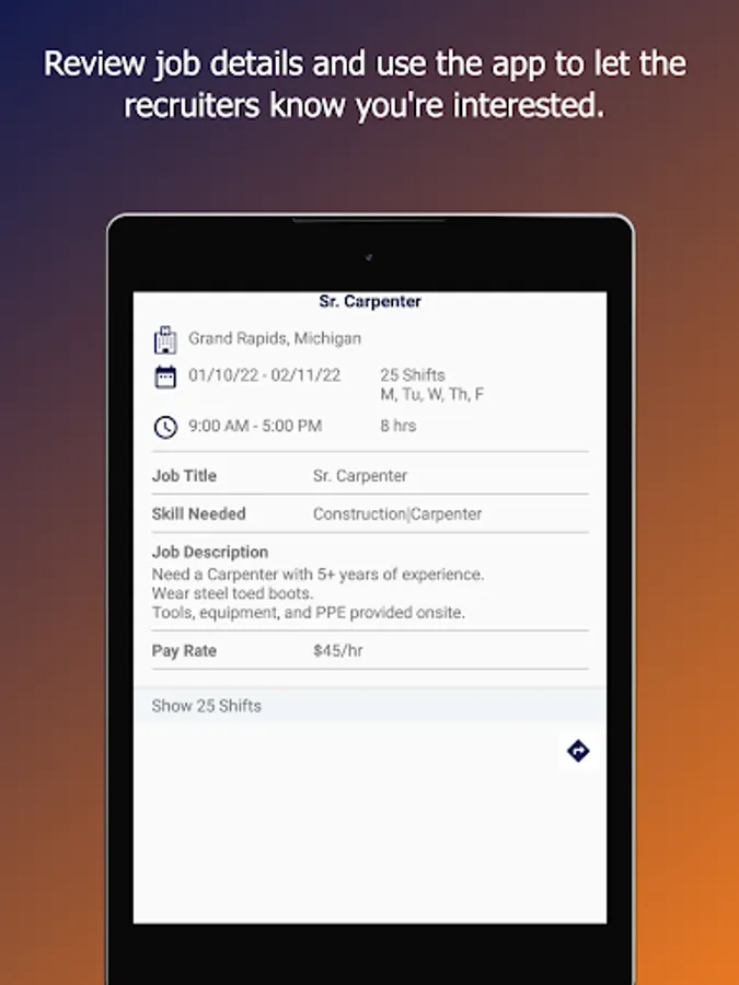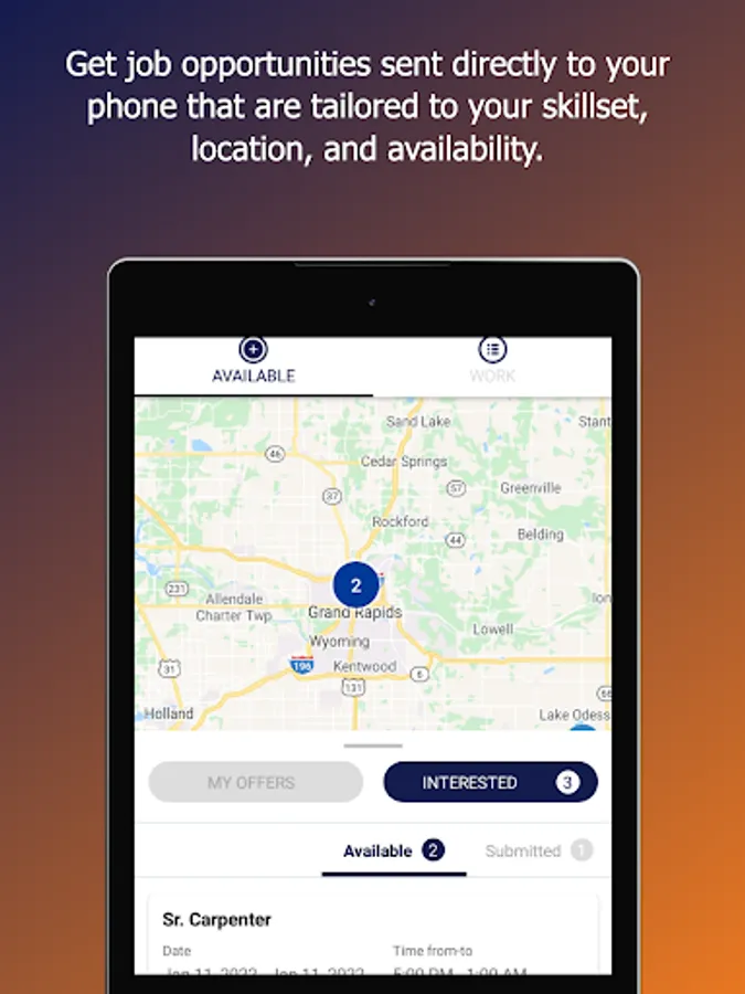 We believe in building a better America together, one local community at a time, connecting contractors and tradesmen. Use our mobile app to save the jobs you like to further review them later, stay up to date with what is going on in the job market of your trade with job matches sent to you, enter your hours worked, access your personal mobile profile to submit time sheets, sign documents and more. We are located in Michigan and Wisconsin.