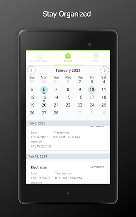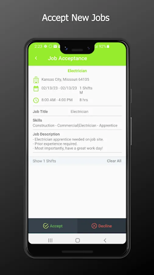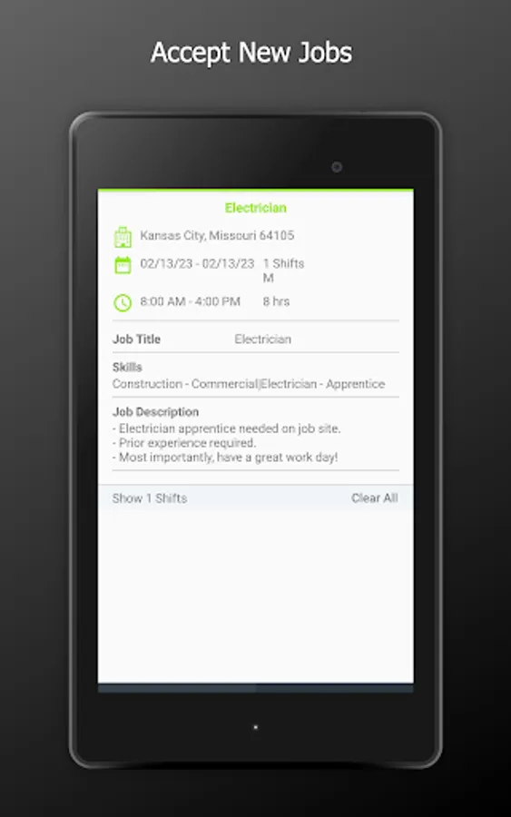 Accept jobs and view worksite details such as address, directions, start and end time, contact info and job descriptions.