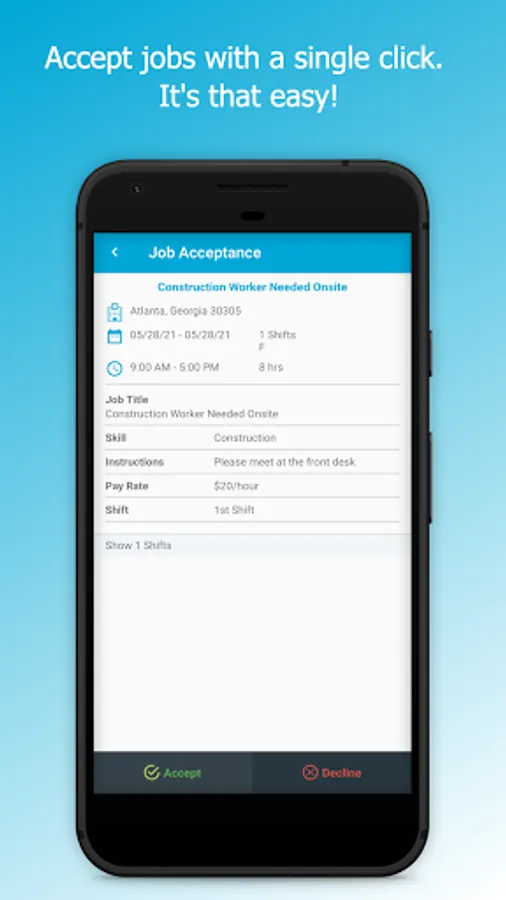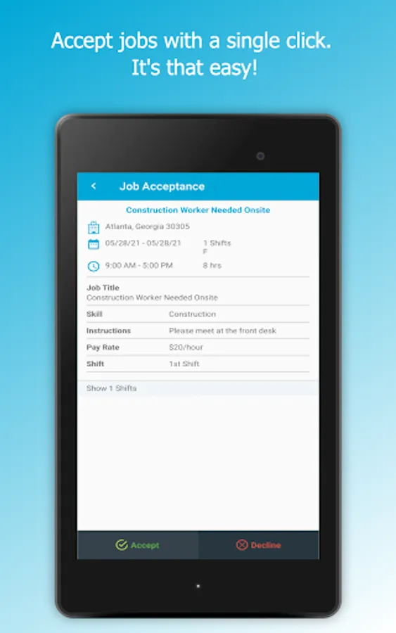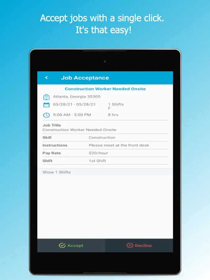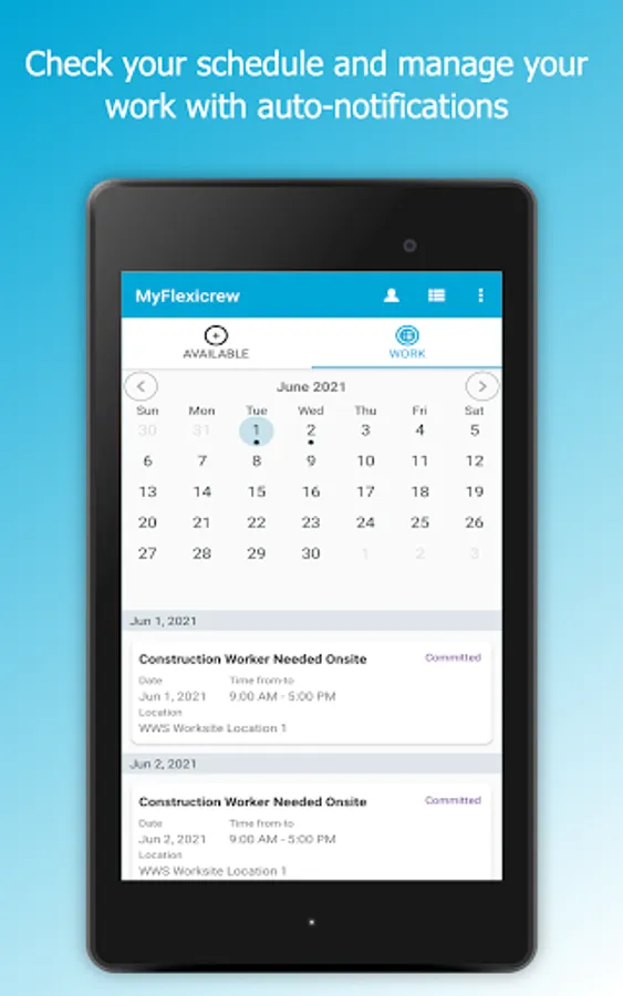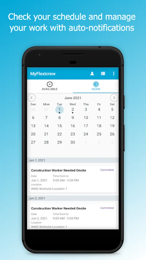 Text: Finding your next job just got easier! Use the Flexicrew app to find jobs you like and companies you want to work for. Work on your schedule. Check your schedule and hours, pick up a shift, and get reminders on your phone. Click. Apply. Work. It’s that easy.