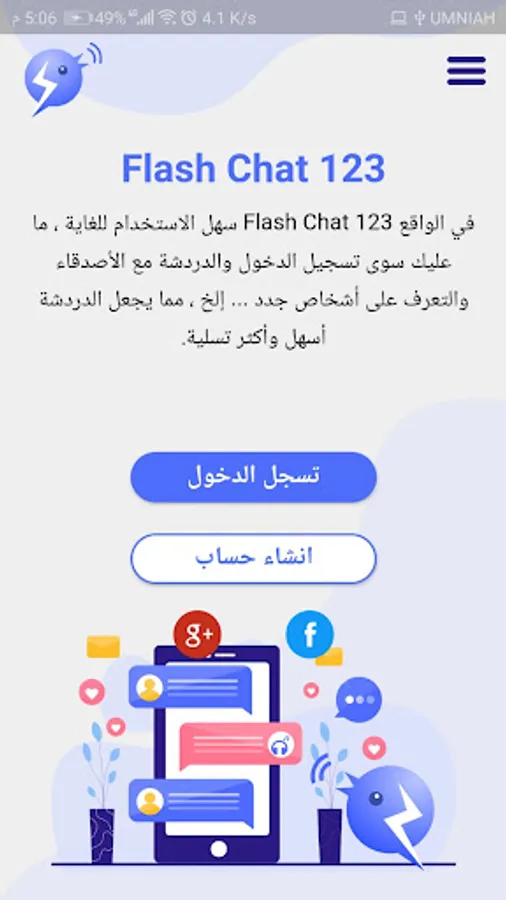 تطبيق 123 Flash Chat هو تطبيق للتعرف على اصدقاء جدد وللدردشه الجماعية ويمكن من خلاله التواصل فيديو مع الاصدقاء