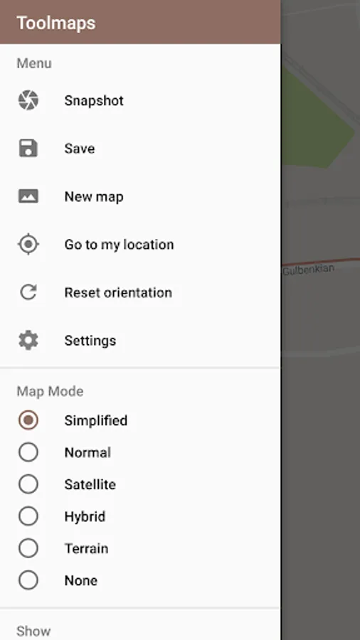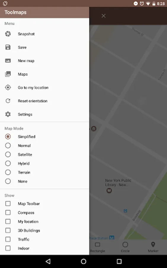• from the navigation drawer easy switch from different map mode: normal, satellite, hybrid, terrain