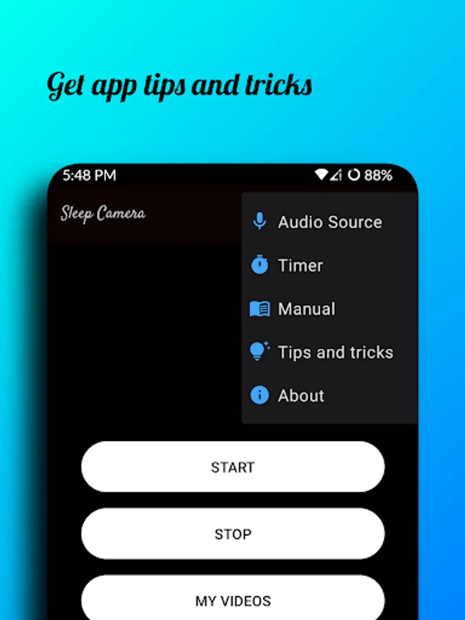 Sleep camera is a tool designed to push your android device to it full potential. This is achieved through by breaking the limitation of most android default camera software capabilities. With this tool you simply get a chance to record in the background with just few simple clicks with simplicity put in mind.