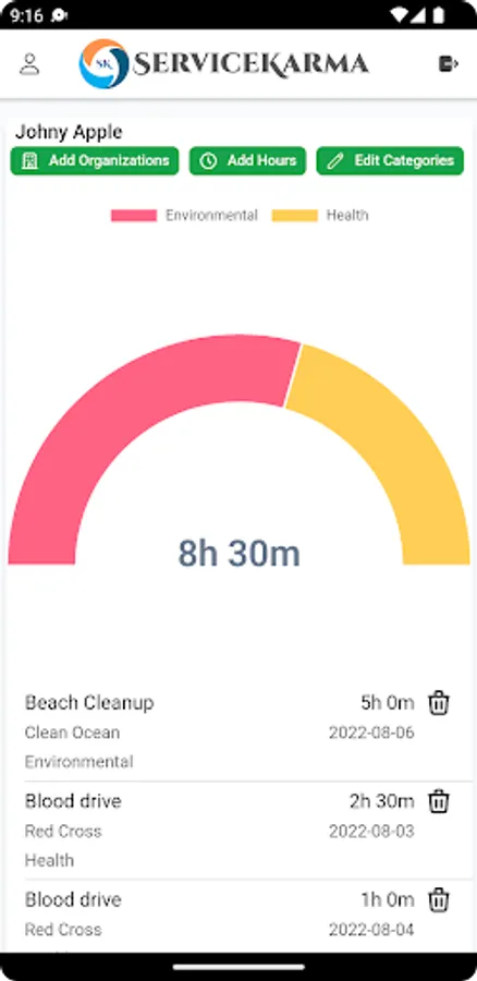 · View a percentage breakdown of the types of services you’ve contributed to, environmental, human services, sports, education, etc.