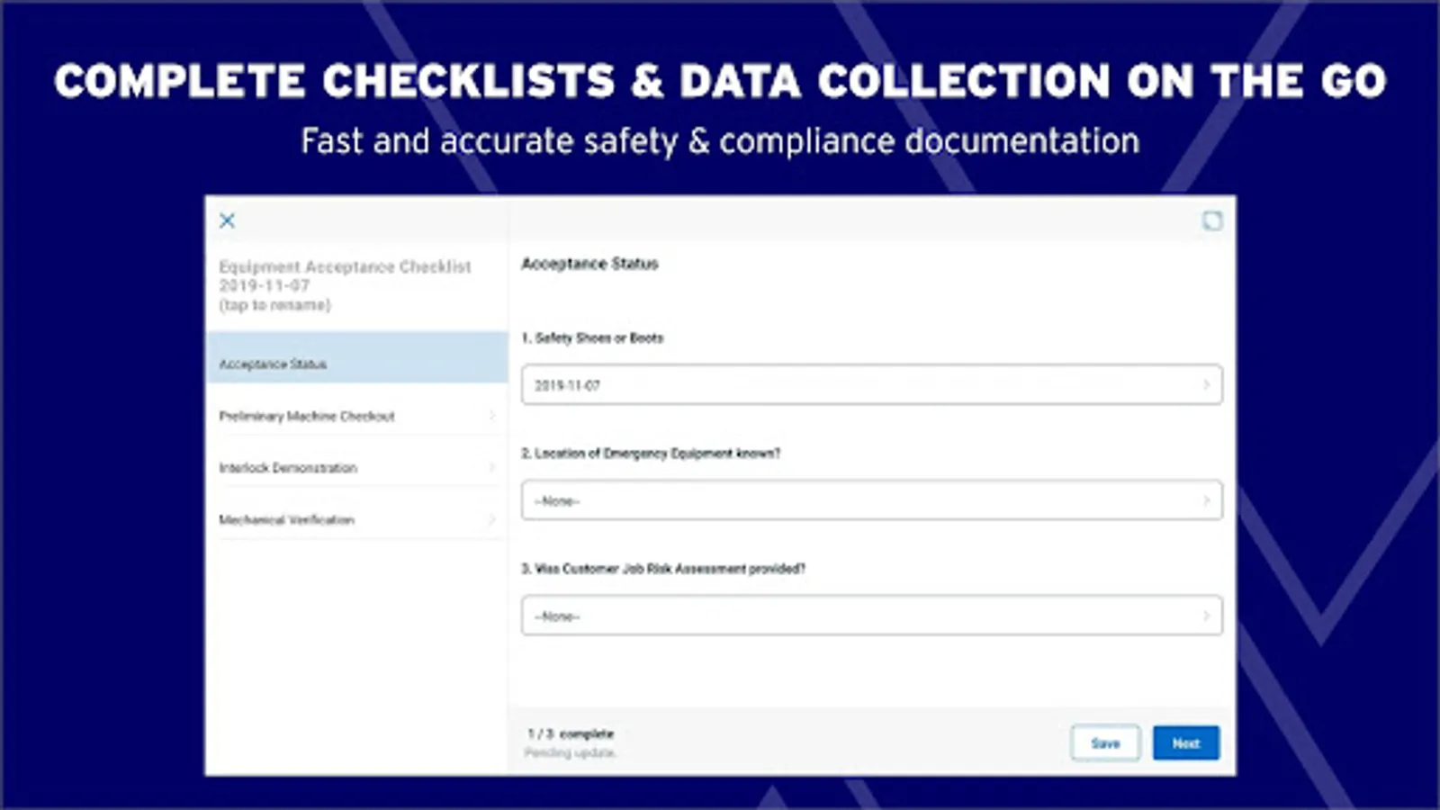 • Templatized checklists with section navigation, progress status, and inline navigation for inspections, safety checks, diagnostics, and more
