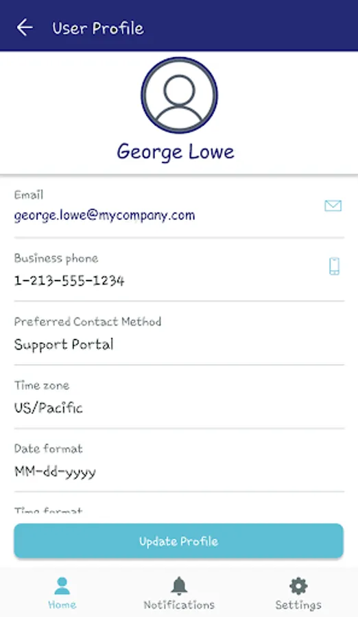 User profile information can also be updated - including phone number, preferred contact method, date/time format, and time zone.