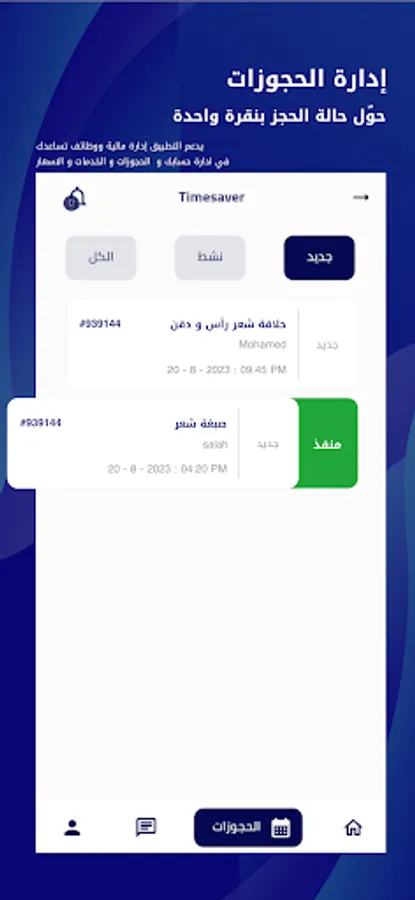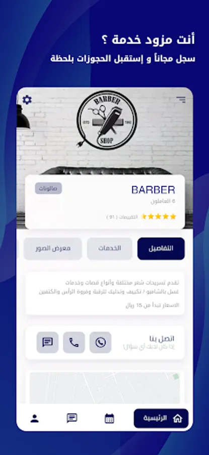 Providing and managing the electronic reservation service for all private and public service providers who wish to schedule appointments for the services provided, and creating a database for each customer service provider and meeting the customer’s desire not to wait and call. The application also provides the customer with an integrated profile of the service provider, including customer evaluation and the ability to add the barcode for each provider. Service in easy and uncomplicated ways and adding it to his favorite lists. The application includes scheduling appointments according to availability, and also the ability to send group messages to customers and service providers for the purpose of marketing and others. The categories that benefit from the application: women’s studios - salons - beauty centers - massage centers - cafes - restaurants - Seasons and events - clinics - chalets and other service providers.