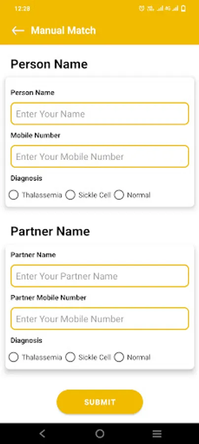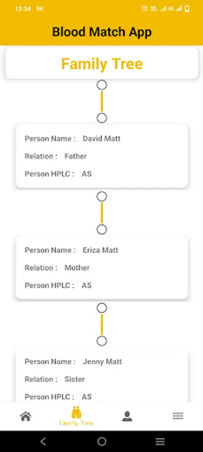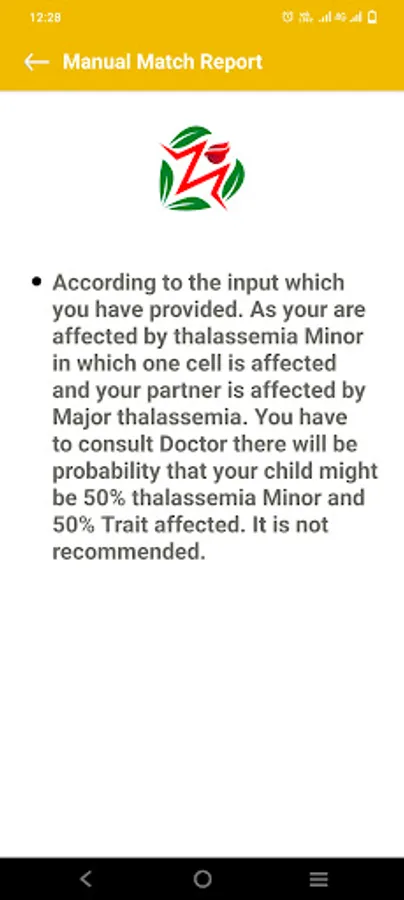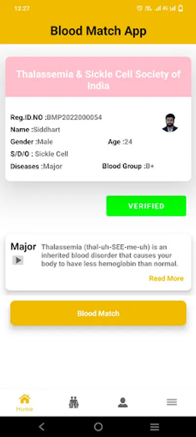 "The Blood Match App" is India's first blood matching app for partners to detect thalassemia or sickle cell disease. The Blood Match team devotes their efforts to eliminating Thalassemia and Sickle Cell Disease in India. By manually entering your information, this program will provide you a digital card from the sickle cell and thalassemia society, based on the lab test you had done or whether you were a patient tested at Dr. Rinky Rughvani's lab. There will be another concept called blood match in which you have to enter your information as well as your partner information it will provide you information depending on what you have inserted. The user will receive the appropriate response based on the input entered, indicating whether or not marriage is advised. The family tree is crucial to this application. We will ask the user to enter the specifics of his family's medical history. So we can assess whether a user has sickle cell disease or thalassemia as a result of his or her parents.