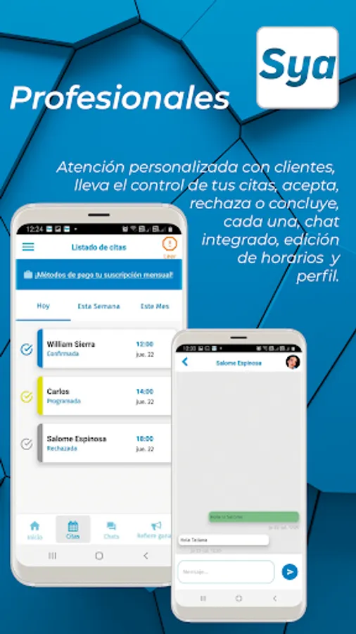 If you are a Professional, Servicio Ya helps you manage your appointment schedule, users will see your profile, locate where you offer your service, and they will also search for you by specialty. It has an internal chat through which your clients can contact you to agree on topics about the appointment, the user will schedule an appointment which must be accepted by the professional and will be able to manage the status of the appointment, until it is concluded. The most important thing is that Service Now only connects the user and the professional, they agree on the terms and conditions of the service, including payment methods. The use of this application module will have a monthly charge for the professional.
