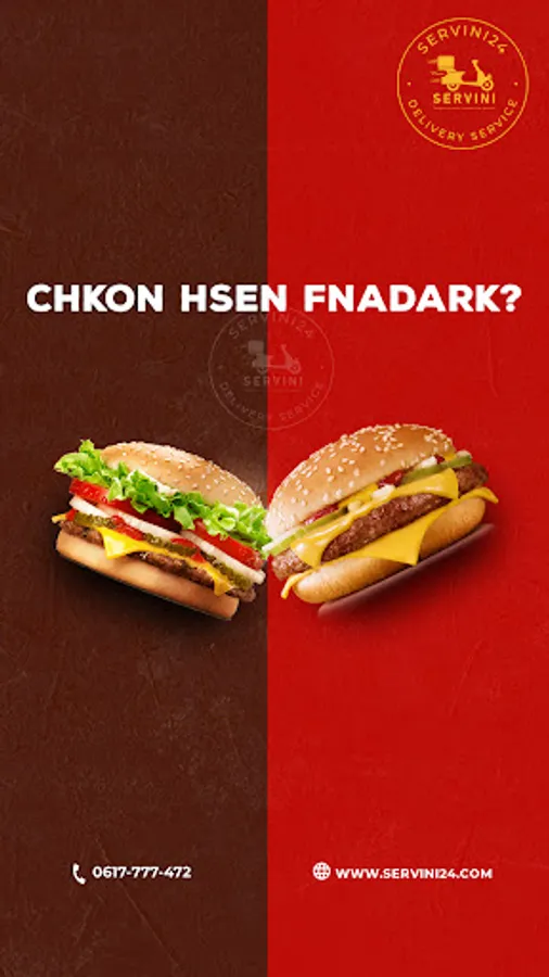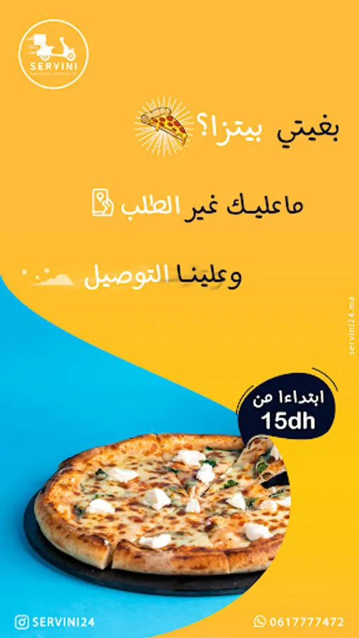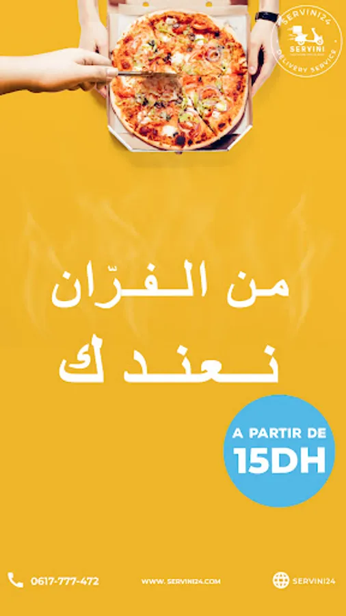 Are you looking for a food delivery service in Morocco? With our new SERVINI app, it's simple. Choose from thousands of markets and restaurants in your city to satisfy your hunger, whether it's for pizza, burgers, or groceries. We've got it all: quick delivery, limitless options, simple online payment, and vouchers at your fingertips.
