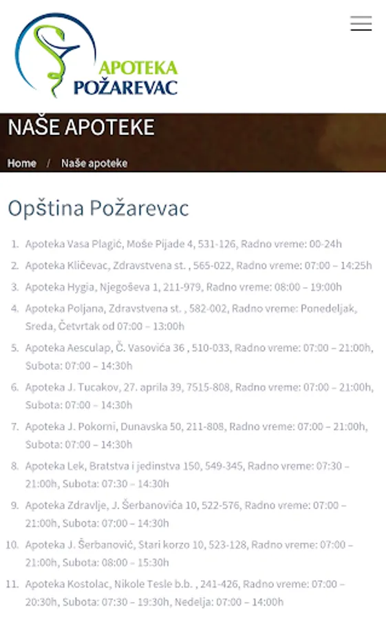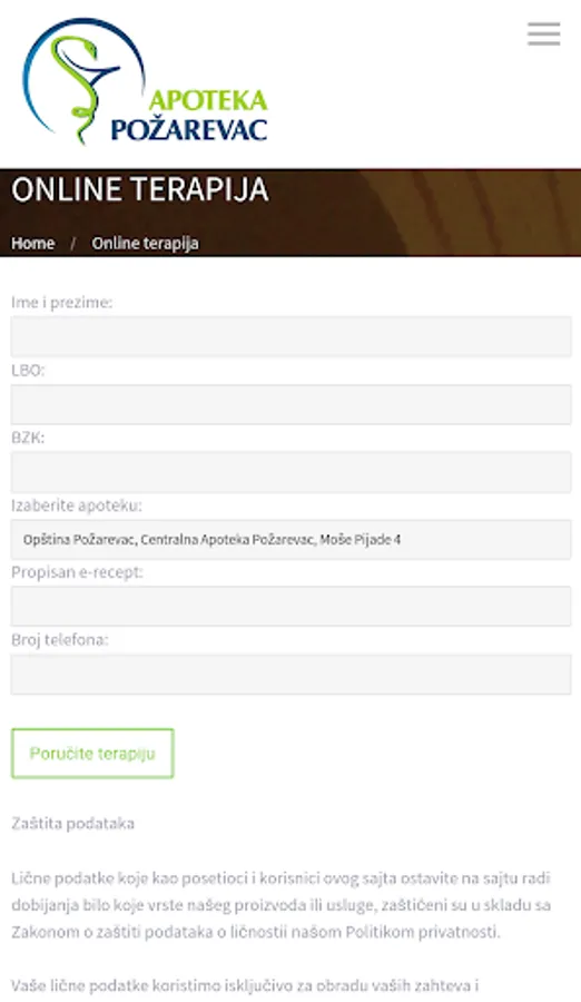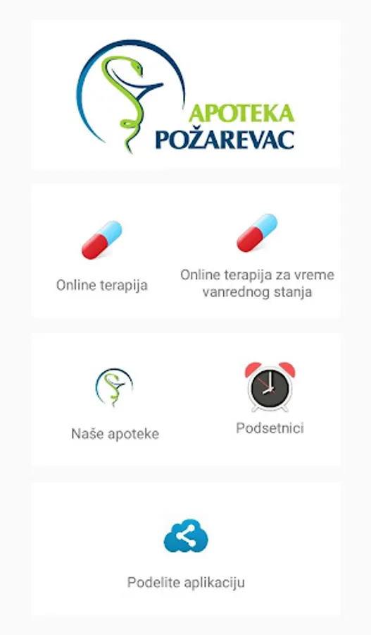 PHARMACY POZAREVAC is an application of Pharmacy Institution PHARMACY "POZAREVAC" intended for smartphone users with the purpose of easier and faster informing about the locations of pharmacies with working hours, contacts. As for ordering online therapy.
