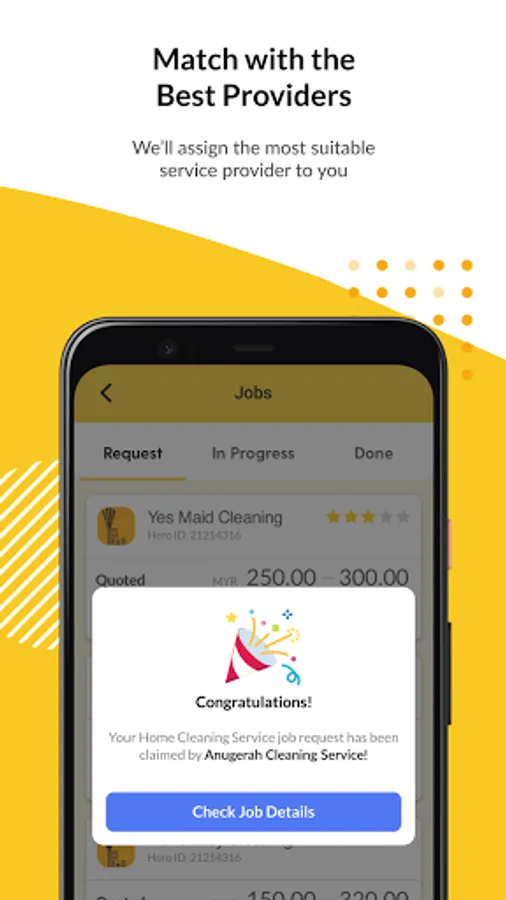 Hire the best helpers for your tasks on ServisHero. We’ve got Part-time Cleaners, Handyman Services, Aircon technicians, disinfection agents and more. With our fair and transparent pricing, you know you’ll always get a good deal. You can book securely and pay via the mobile app.