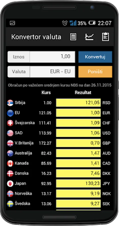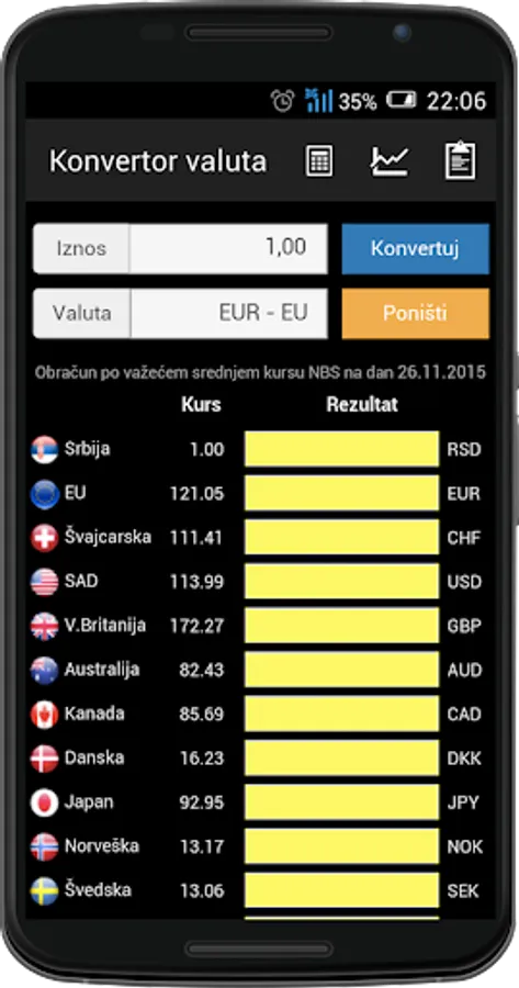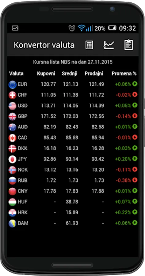 This app will give you quick and easy way to have daily overview for 30 foreign currencies. This converter is based on official exchange rates published by National Bank of Serbia. Exchange rates and currency conversion calculator, historical rates and graphs.
