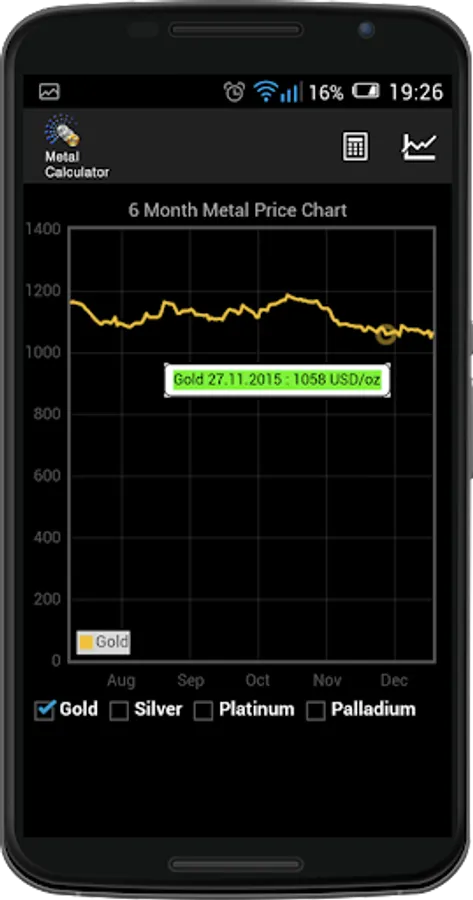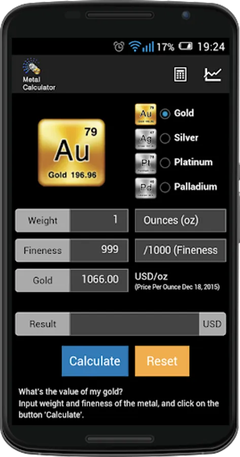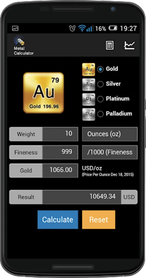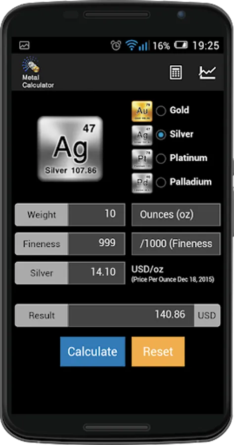 Precious metal calculator offers easy and simple way to calculate current value for gold, silver, platinum and palladium. For given weight and fineness it will give you estimated value in USD, using current market price.