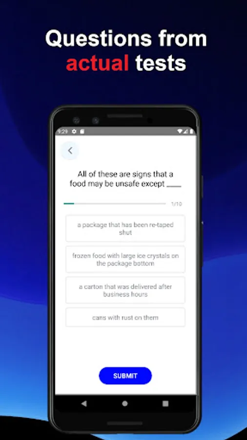 Prepare for the ServSafe test with actual test questions. Learn about food safety, allergens, alcohol regulations. All the app's material is based on official ServSafe resources and actual test questions. Practice with the questions that you will be asked at the ServSafe Food Manager, ServSafe Food Handler, SerfvSafeAlcohol, and ServSafe Allergens tests.