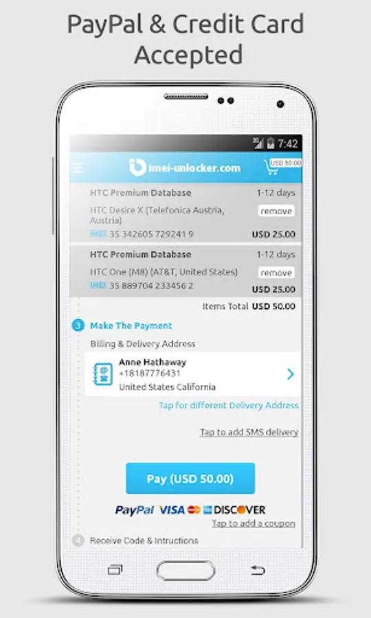 ★ It is possible to pay via PayPal or using a Credit/Debit Card. Imei-unlocker | Network Unlock it is integrated with latest PayPal Android application and includes newest fingerprint security functionality. If you choose to pay with a Credit/Debit Card it is enough to take a picture of the card.