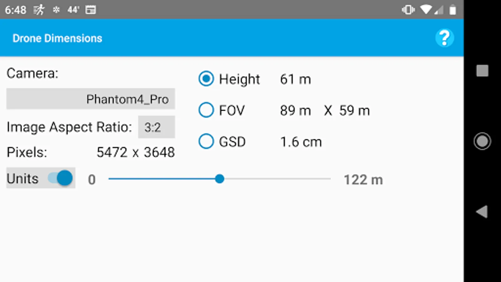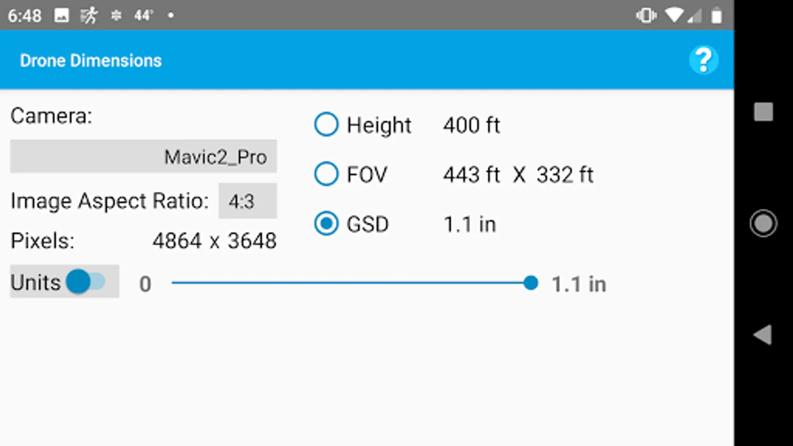 Drone Dimensions is a lightweight, standalone tool for aerial photographers and sUAS mapping pilots to easily calculate the relationships between height, field-of-view, and ground sample distance. Features include English or Metric units, selectable independent variable, and a built-in database of common drone cameras.