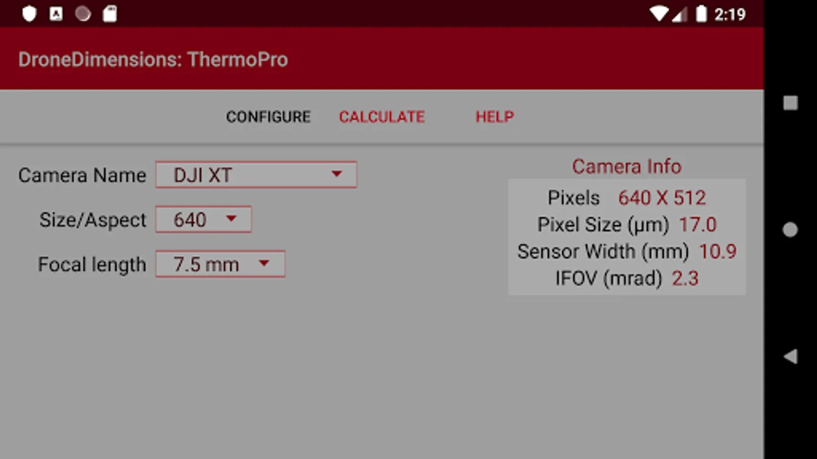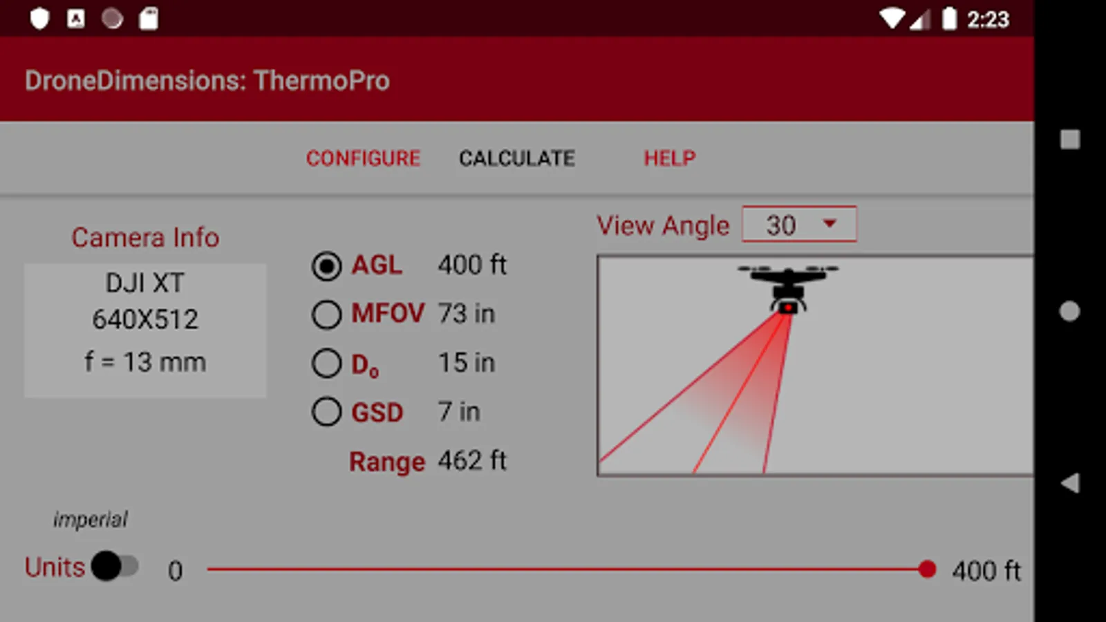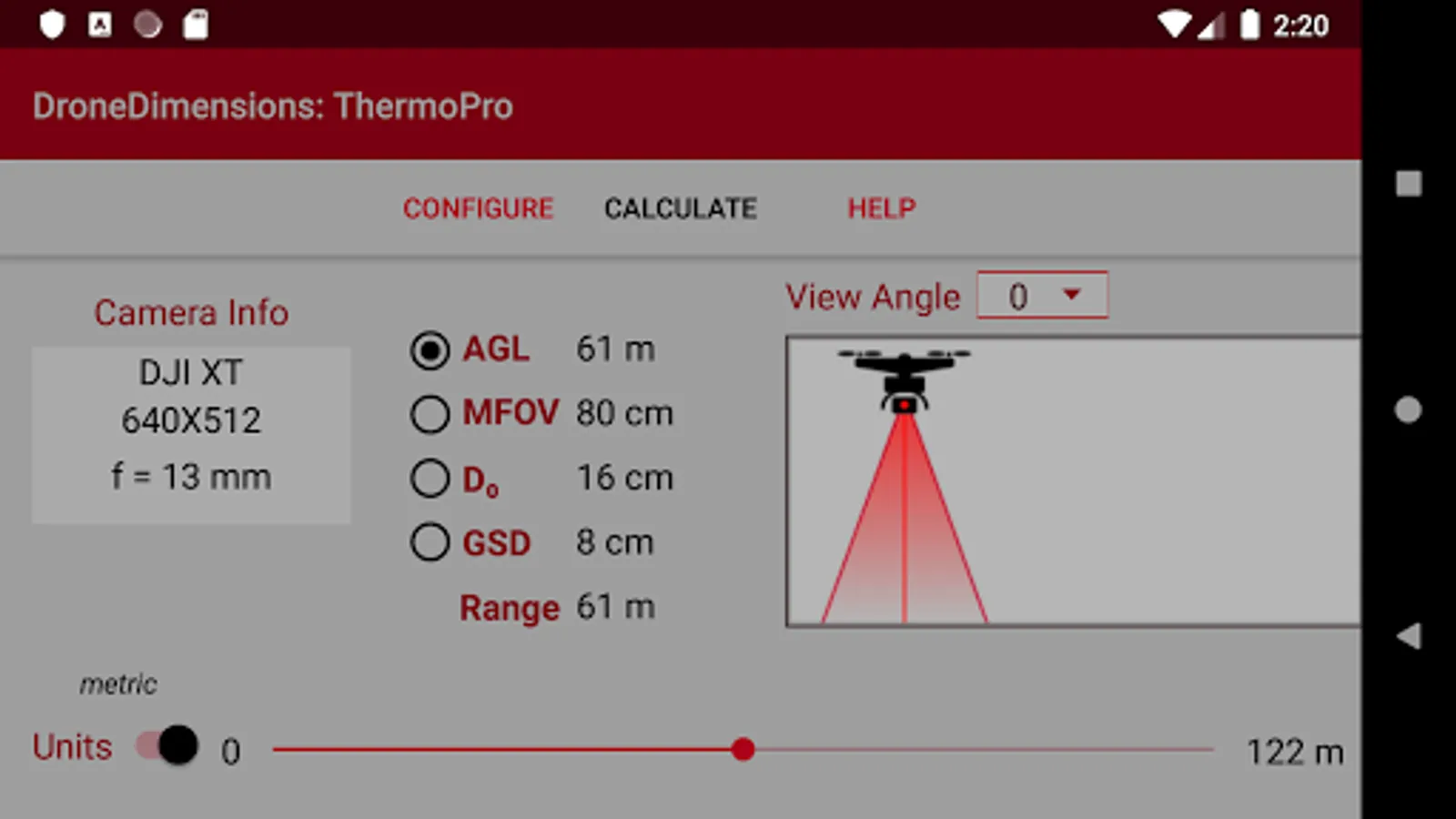 This app helps users set their flight altitude and camera view angle to achieve the results they need. It calculates the relationships between various image parameters and altitude for sUAS (drone) pilots using thermal cameras. Calculated variables include ground sample distance, measurement field-of-view, Johnson detection criteria minimum object size, and slant range.