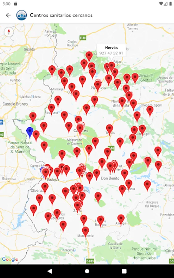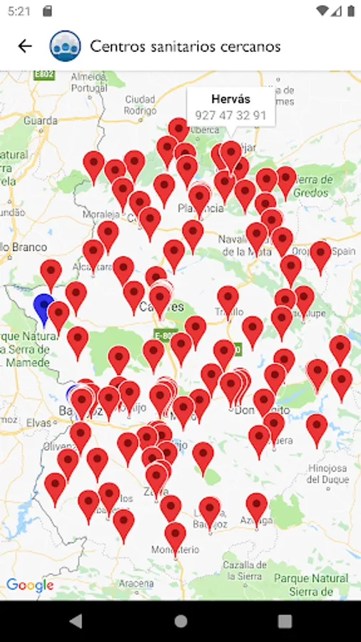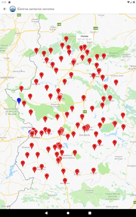 * Interactive map of Extremadura with the location of all the health centers of the SES, on which the action protocols are marked.