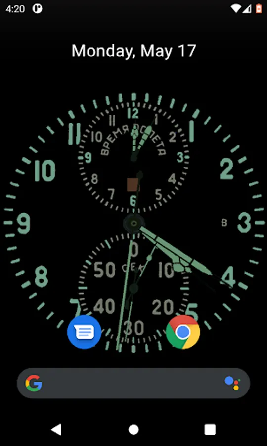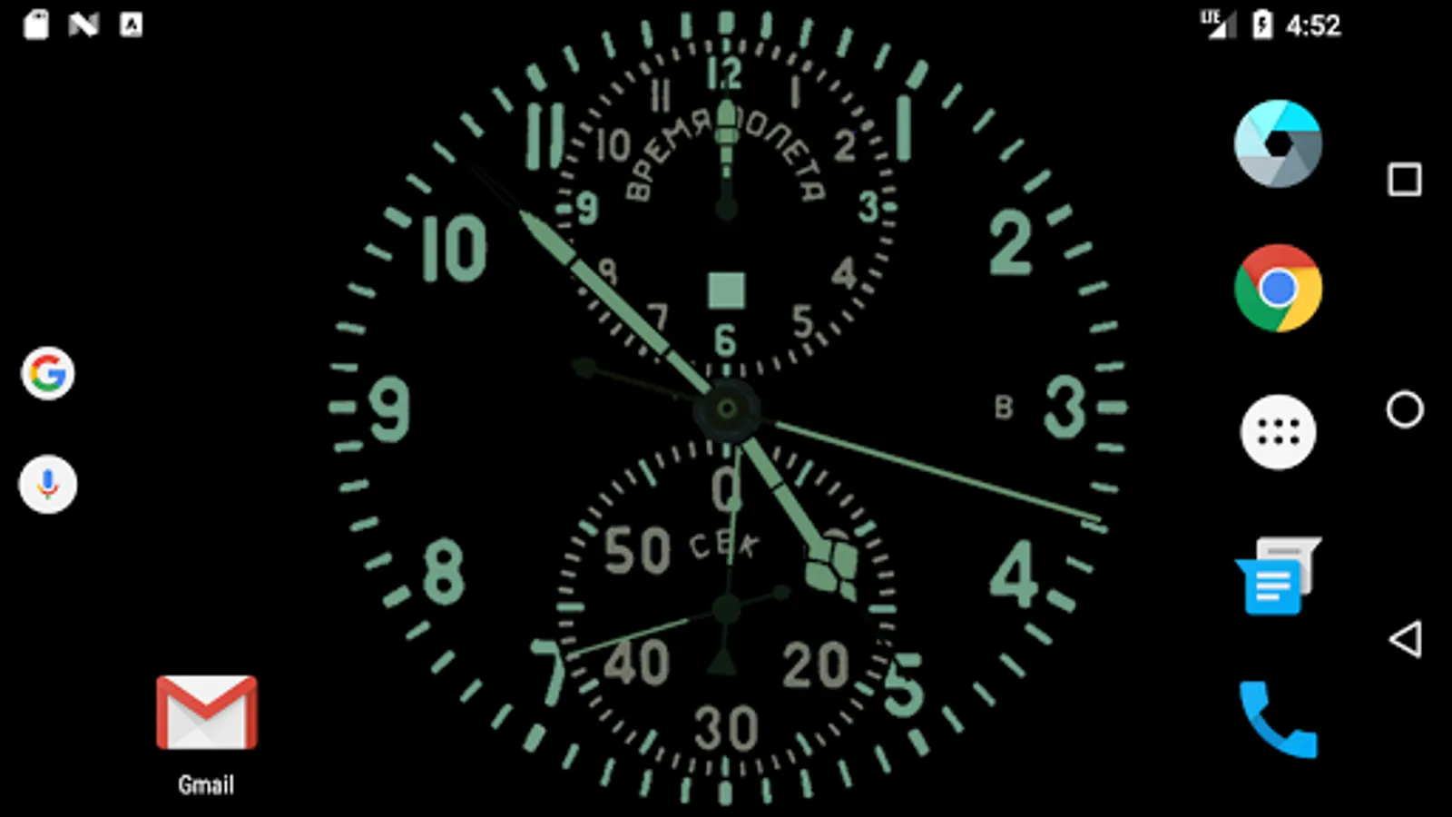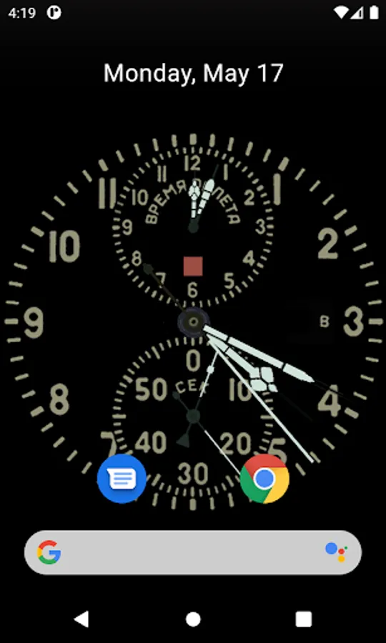Wallpaper for android devices in the form of an aircraft desk analog clock with second hand and two timers. The timers are toggled between on/off/reset with a double tap in the region of the corresponding timer face. The clock is following closely the looks of the famous ACS-1 which was on board of all Soviet aircrafts and can be found even nowadays. The face is black, the hands and marks are whitish. In low ambient light the face and hands turn to greenish like in the real clock.