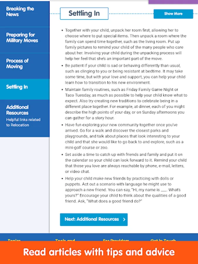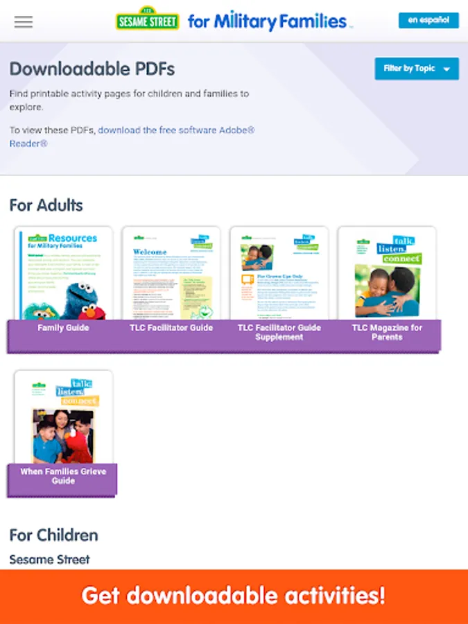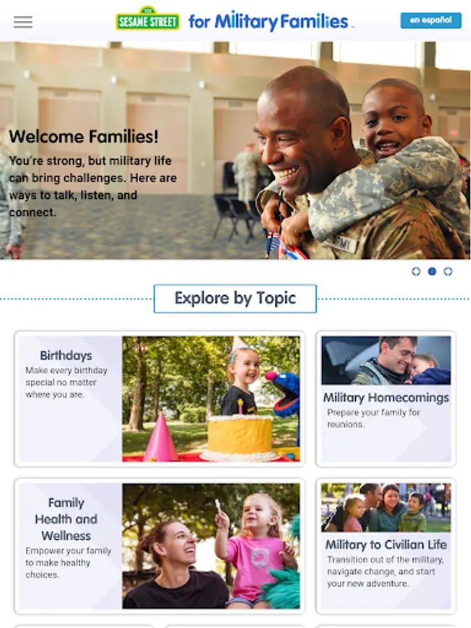 Developed for parents and caregivers: The Sesame Street for Military Families app puts all of Sesame’s bilingual (English & Spanish) resources for military families right in your pocket! Use your mobile device to access engaging videos, articles, storybooks, parent guides, and more to help you support your preschool and school-aged children as they encounter transitions common to military families.