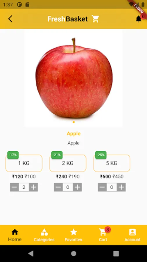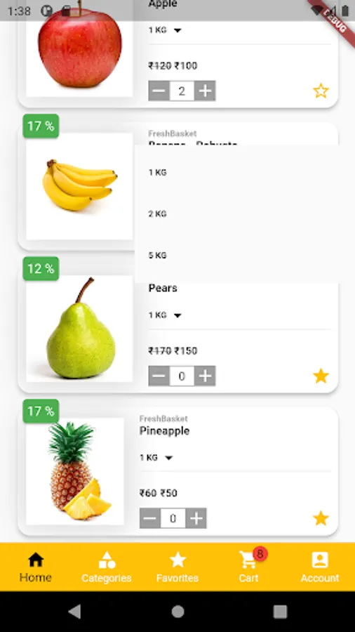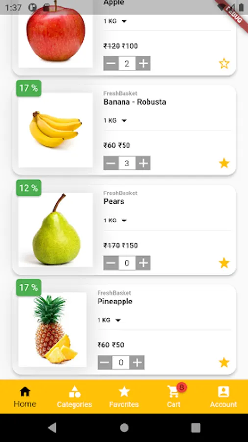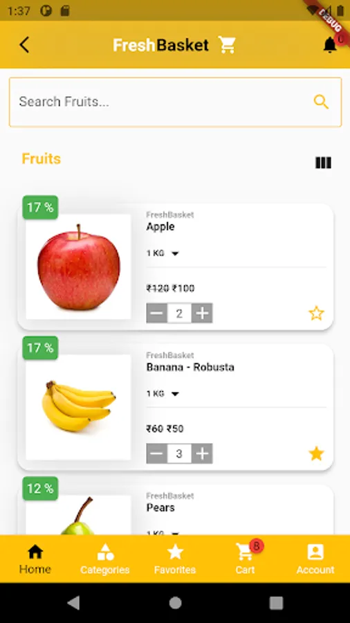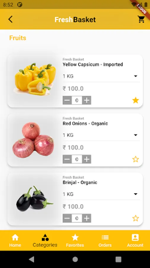 You can easily order groceries and staples, including Namma FreshBasket Grocery on our app at low prices. From flours, rice, cooking oils, dals to masalas, our app makes grocery shopping extremely convenient. Also, shop for packaged food like biscuits, ready-to-eat, canned food and health food at the click of a button. You can also buy fresh fruits and vegetables online. We offer you fresh and premium quality fruits and vegetables.
