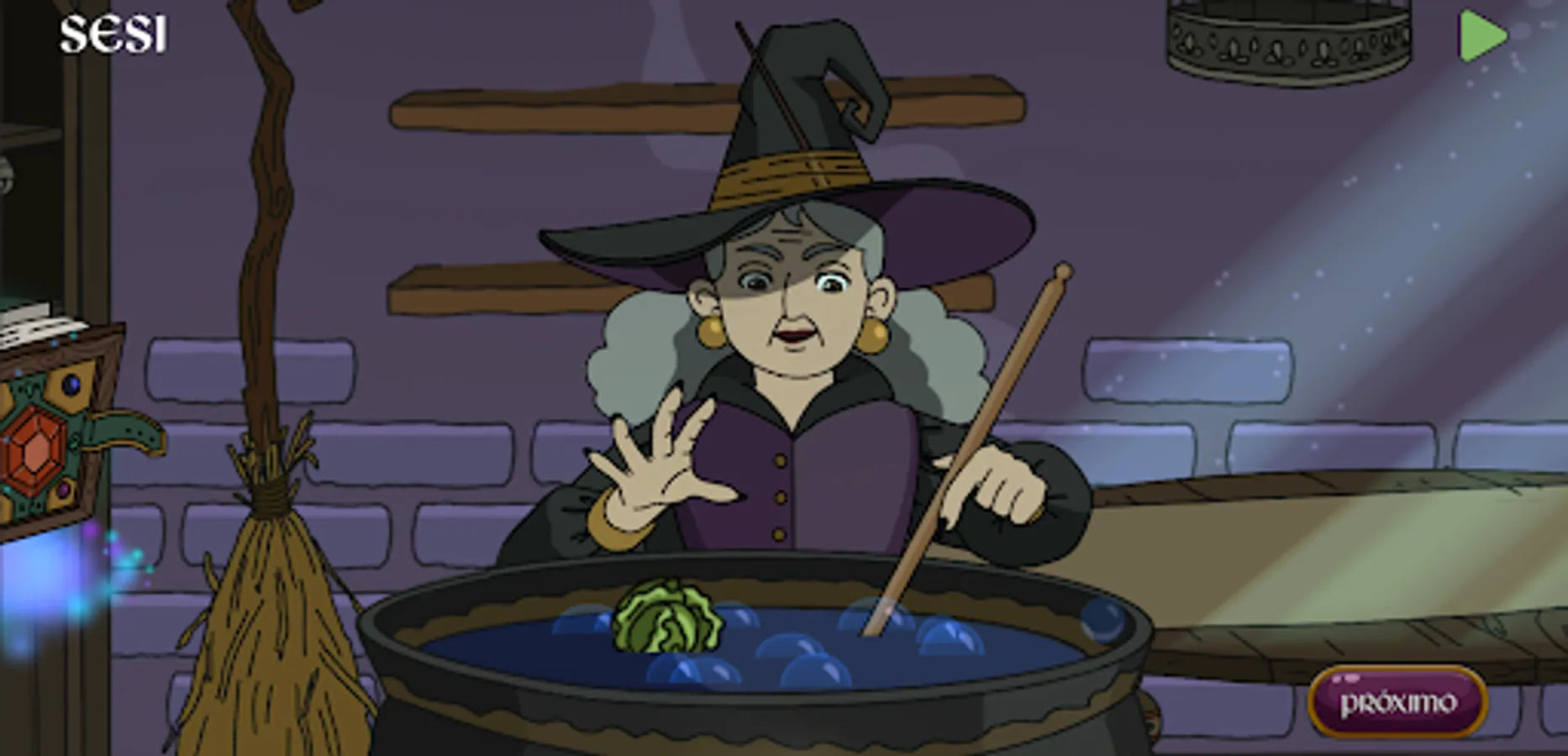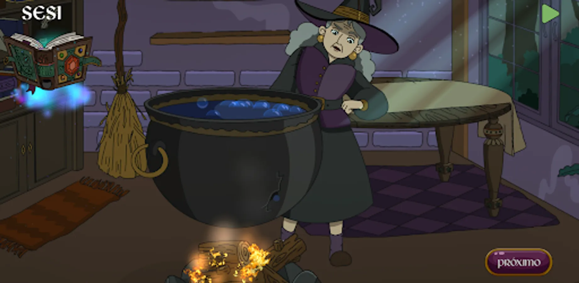 Watch the tale The Witch and the Cauldron and interact with the setting at the end of each scene to hear the English words.
