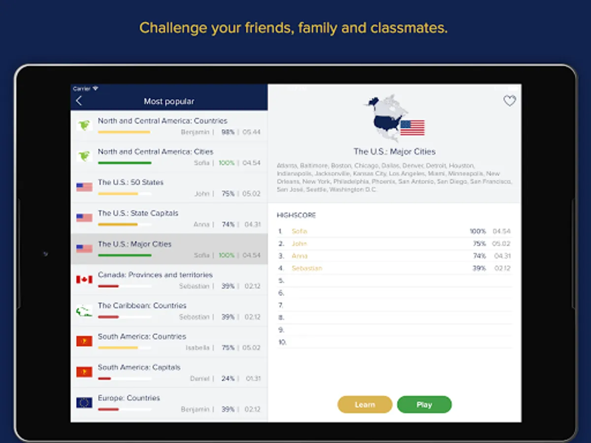 Those who are little rusty on their U.S. state capitals or vague on the current status and existence of those pesky "istans" can browse categories and shore up their knowledge base using the Learn Mode. When ready to test their memory, an interactive map identification task is just a click away.