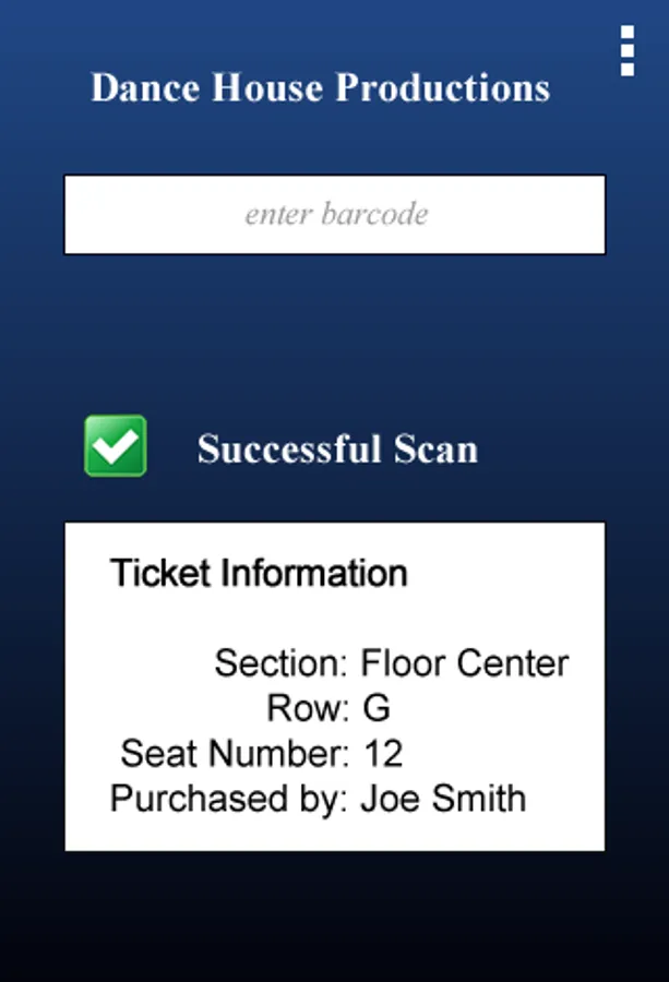 EZ Ticketing is an intuitive and powerful web-based box office solution. Your patrons can easily view your venue diagram and select their tickets by pointing and clicking. Tickets are printed at home or displayed on a mobile device at the door. Each ticket contains a unique barcode which can be scanned at the door for check in. By connecting a Bluetooth scanner, you can make any smartphone or table a mobile ticket scanning station. As you scan the tickets the patrons are checked in, and you receive visual and auditory feedback of the ticket status, whether it is a successful check in or not.