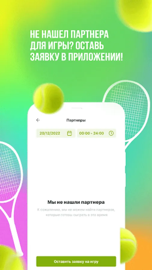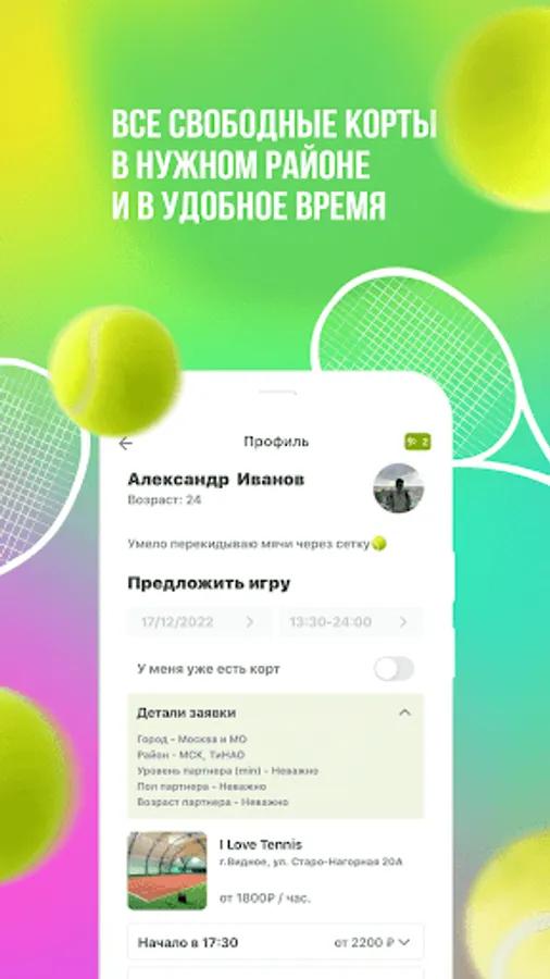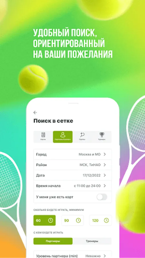 1. With the help of convenient search filters (place, date, time and duration of the game, partner or coach level, age and gender), you can quickly find a suitable free court, partner or coach;