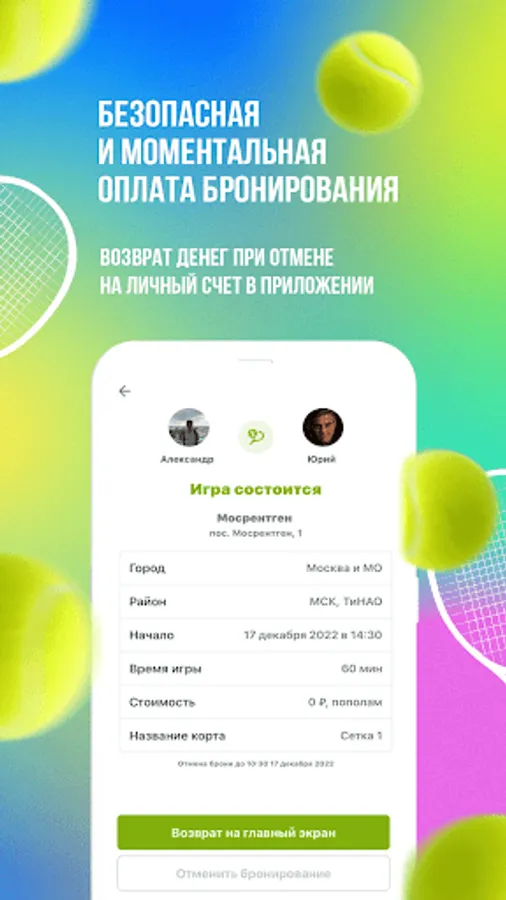 4. Do not worry about money - in our application, secure and instant online payment for booking a court or coach services. When canceling a booking, a refund is made instantly to the user's personal account in the application;