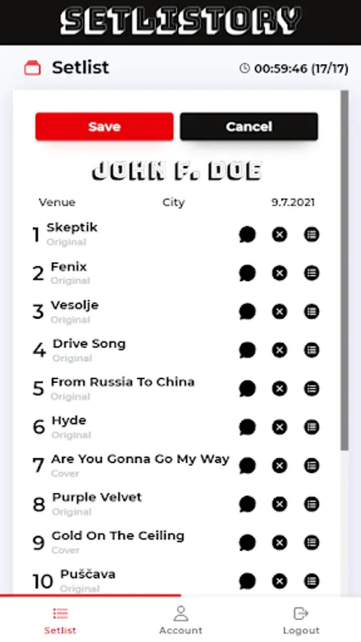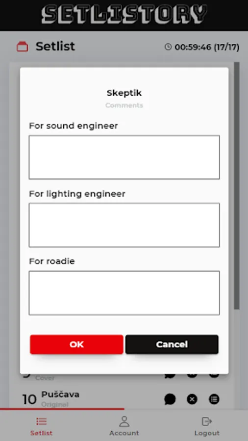 Songs are then added to the setlist and ordered via a simple drag and drop interface. There is a comment section for each song available; they are sound engineer comments, lighting comments and roadie comments.