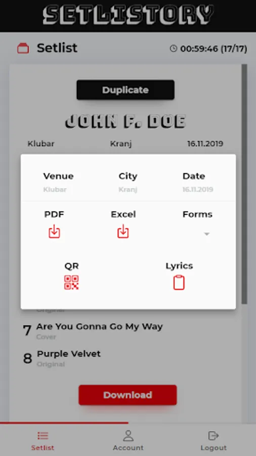 • Export to forms - some countries have mandatory forms which need to be filled out (like SAZAS forms in Slovenia) - Setlistory fills them out automatically
