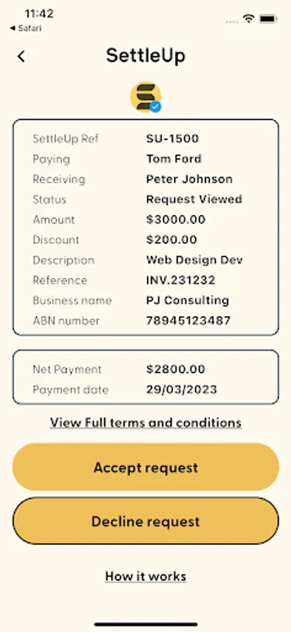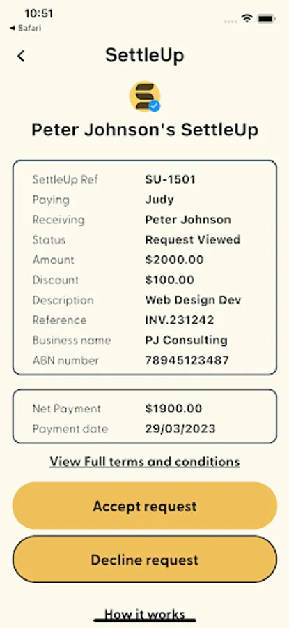 SettleUp offers Australian businesses a frictionless, safe, ID verified way to collect agreed payments from their customer, individually or in instalments using the latest pull payment direct debit technology. Customised payment arrangements set up by a business automate reminders, alerts and  payments so all parties can settle on good terms.
