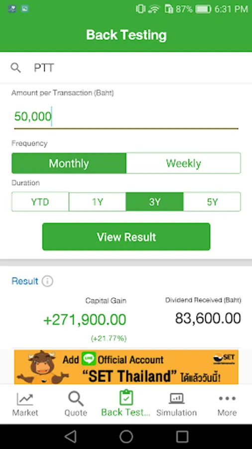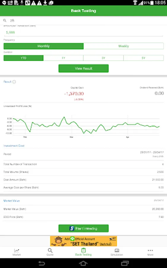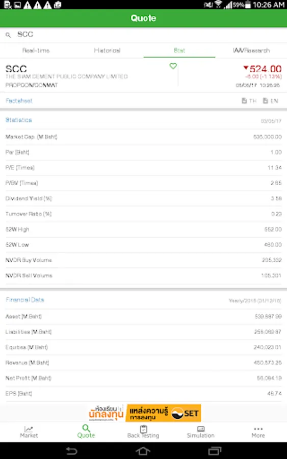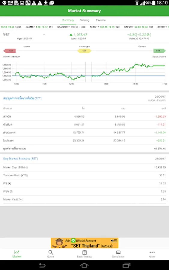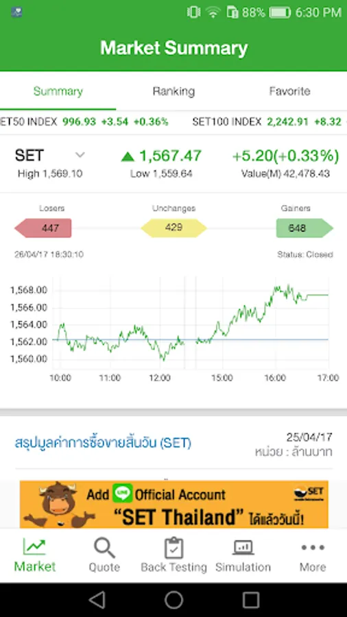 1. Market - To view the SET and TFEX’s market summary, top ranking of stocks and futures/options series including record your favorite list.