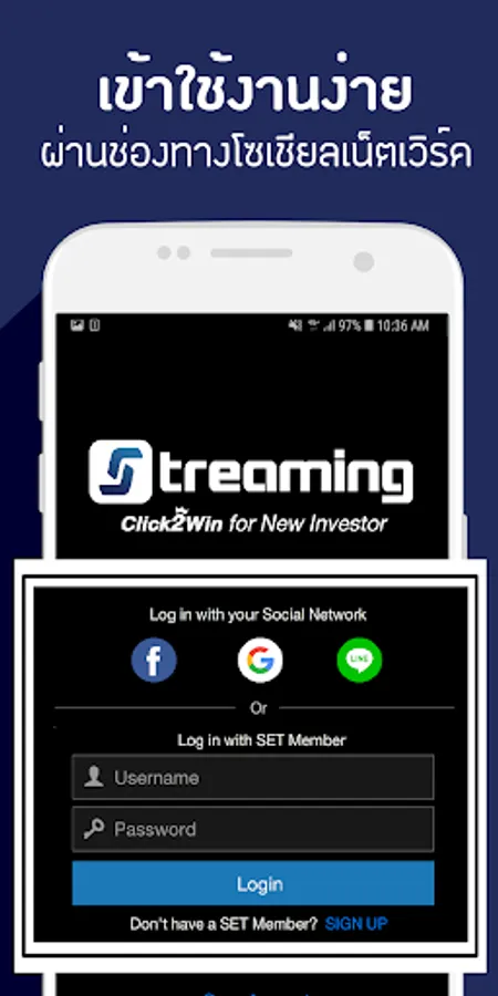 Streaming Click2Win is an application for simulating stock and derivatives trading. You can easily login via Facebook, Line or Gmail. You can access to view information in the market. Simulating stock and derivatives trading more easily