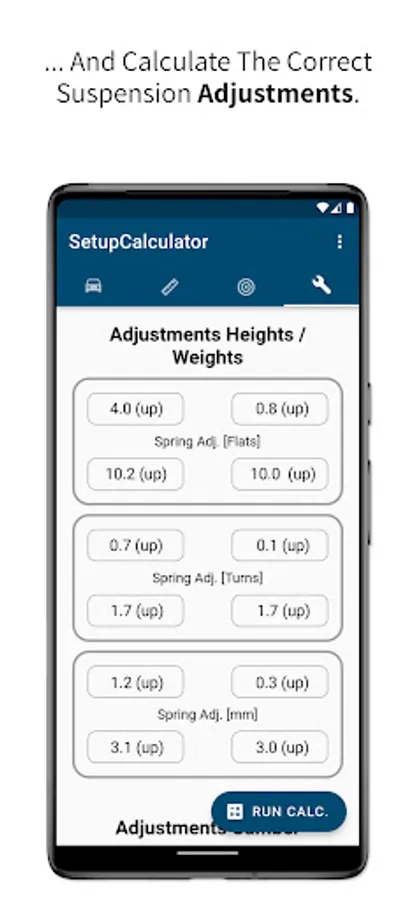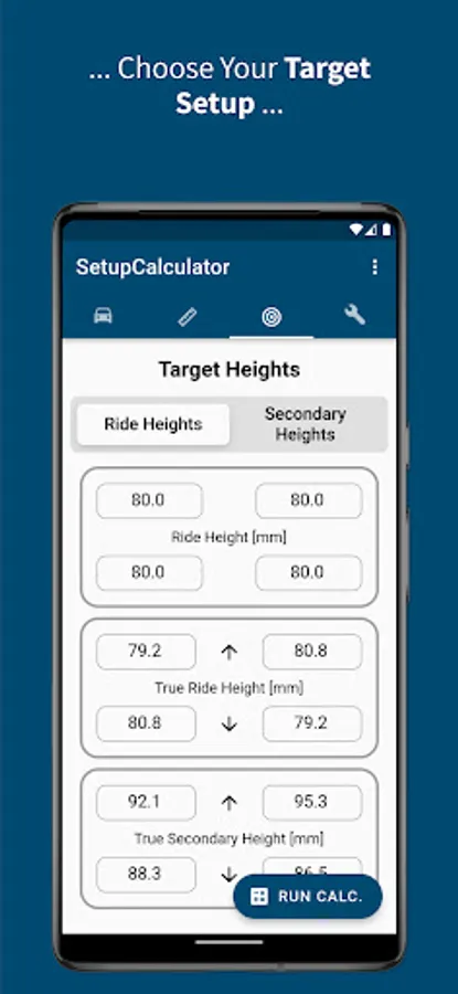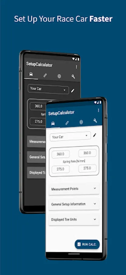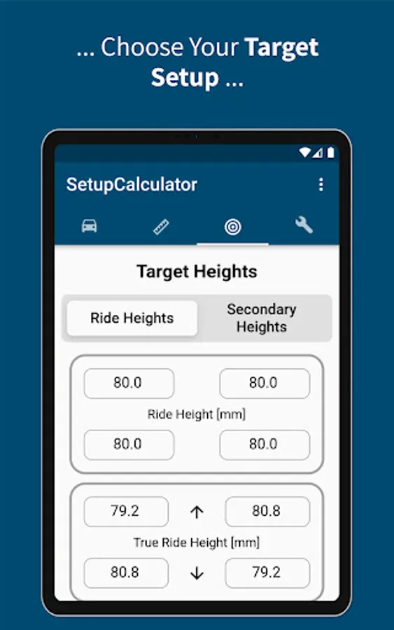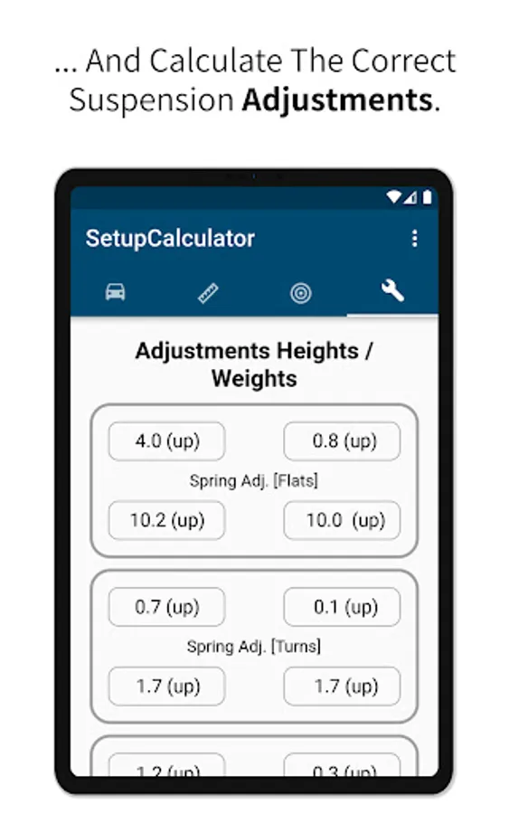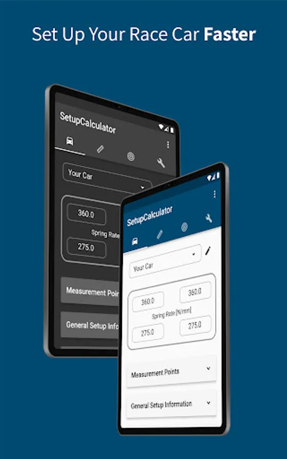 Get ahead of the competition with the SetupCalculator app. Streamline the setup process and get your race car ready faster than ever. Say goodbye to time-consuming multiple measurements and adjustments and maximize your on track time. Download now and experience a new level of efficiency and precision when setting up your race car.