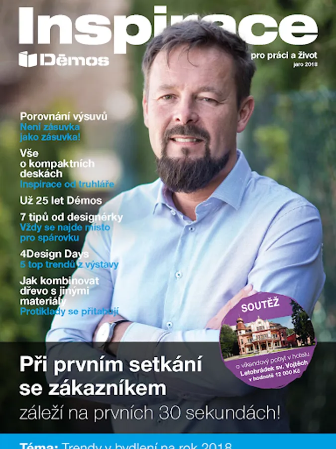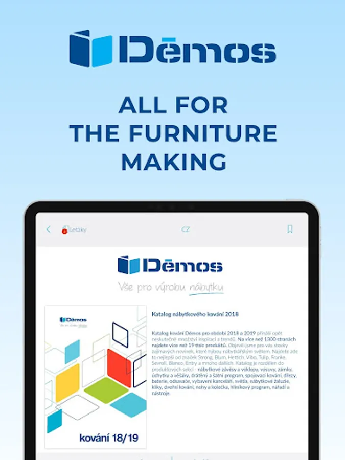 The Demos application gives you easy access to products and advertising materials. You can find all issues of Inspirace magazine, which is full of interesting articles about work and lifestyle. Demos’ fittings and board material catalogues offer a complete list of products from our vendors (Blum, Hettich, Egger, Kronospan and others). It also lets you download VIBO and TULIP product catalogues. In a separate section, you will find Entry and Strong product lists, complete with full technical specifications for easy installation.