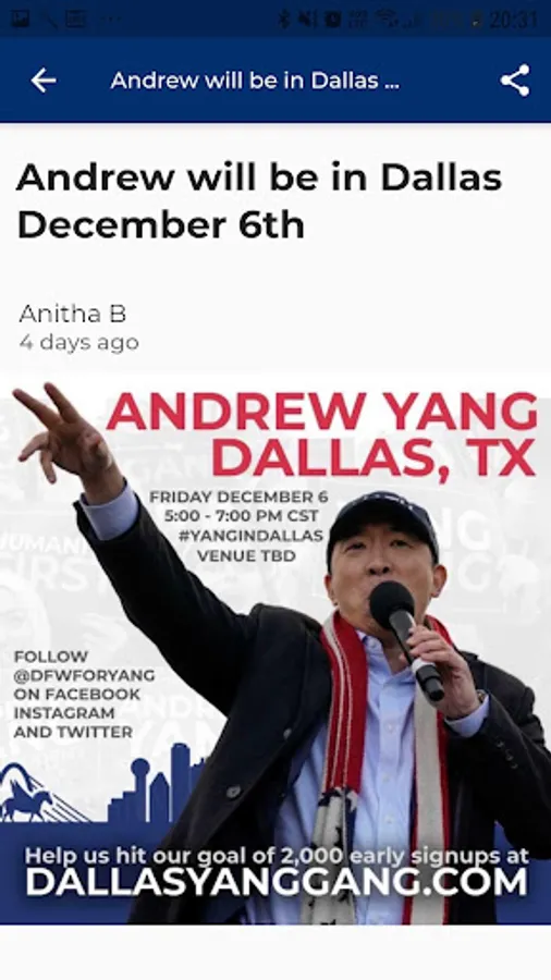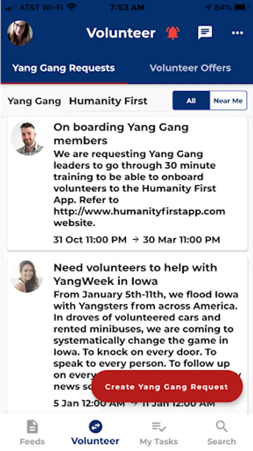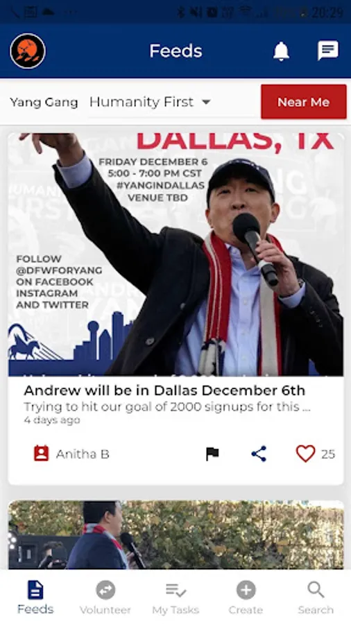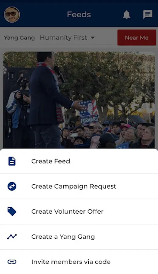 The Humanity First App is for Yang Gang volunteers and leaders. It is a volunteering and communications app. The app can be used to create local Yang Gangs, sign up for tasks and assign tasks to other volunteers. It is a single app for all Yang Gang campaign activities.