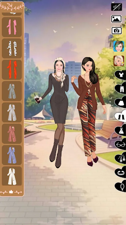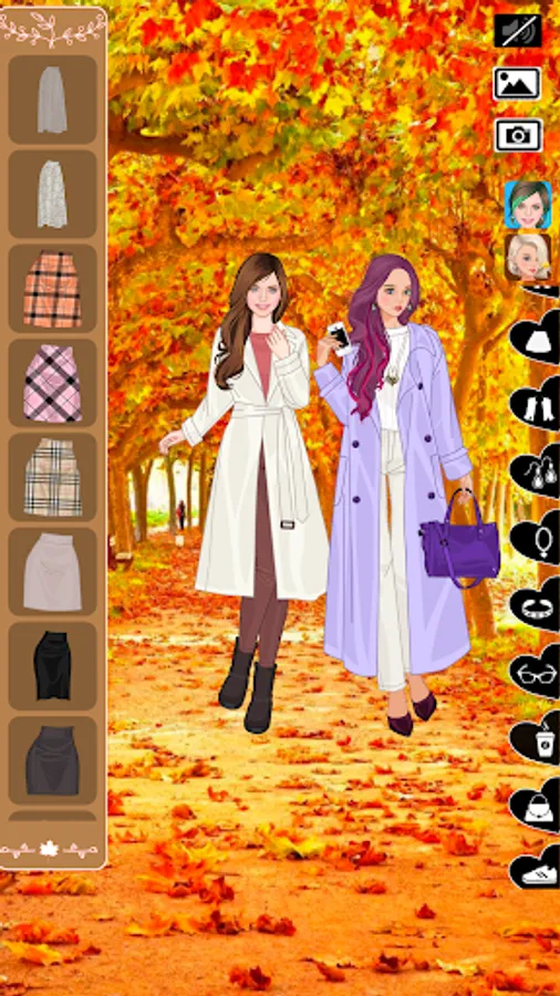It's a beautiful fall day in the city! Both girls may live there, or visit their friends. It's fall season, time to dress up warm clothes and drink hot coffee. And what could be a better challenge than to find suitable dress up for these girls in this game. Sevelina adores autumn colors and these two friends also. Such girls do never wish to have boring dress up during such a lovely period of the year. Autumn is the most colourful time to make your clothes functional, comfortable and of course beautiful. You will definitely love to play this dress up game with a huge amount of autumn clothes and accessories.