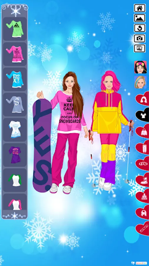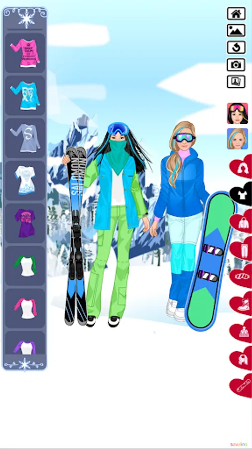 It’s winter! Time to shake your wardrobe for warm clothes. Sevelina knows the proper way to get dressed for this cold time to make a warm dress up. Here you have two friends in various locations during this cold winter. First they got to the ski resort, the marvelous place for two ladies to spend the time with pleasure. The dress up should be appropriate and here is what was prepared for you: fur hats, fur coats, hats-ears, warm leggings and jeans, skis and snowboards, gloves and mittens, winter boots and hi-tech coats, ski goggles and many more. But before you put all this on, you should select your hair style and underwear.