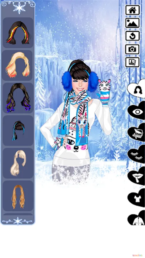 She should complete a proper make up before starting her proper dress up. Try some lashes, a gorgeous hairstyle and all cosmetics selected by Sevelina are at your service. Change her eyes color with varieties of contact lenses which perfectly suit her lipstick. More of red will look perfect as a contrast to snow, cause it is winter time, time to play dressup game.