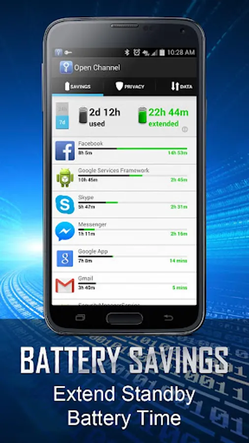 Many apps use the network and drain battery in the background. As you use your phone, we show how much they affect your battery life and how much Open Channel extends it for you. Open Channel’s smart algorithms work in the background to increase standby battery life. Unlike other battery savers, there is no need to configure any power management modes or block apps to save battery.