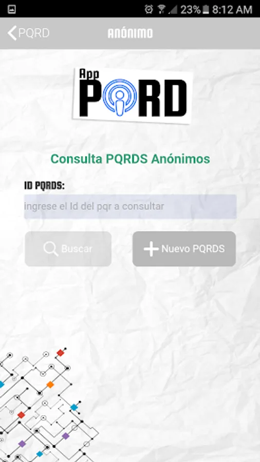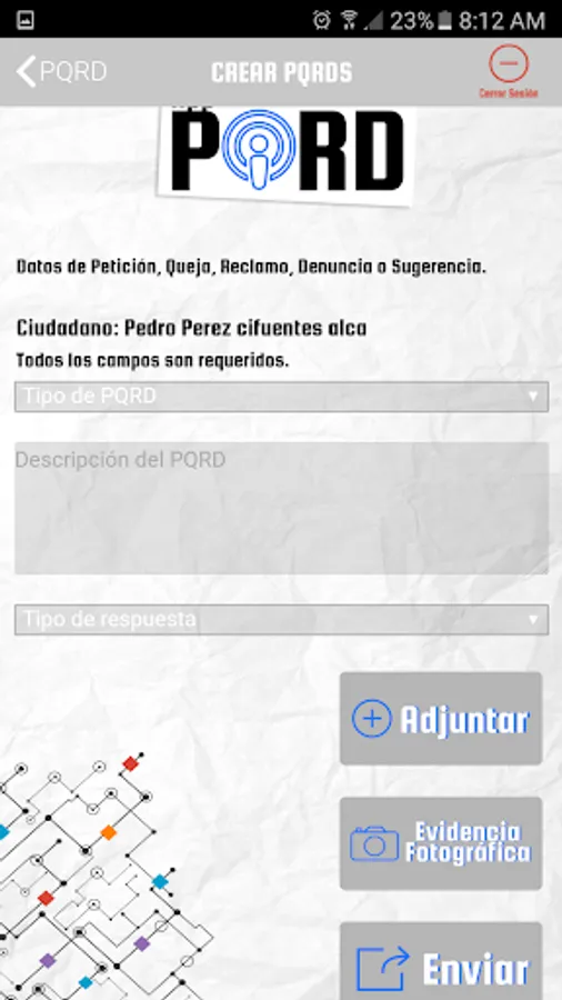 The application consists of two sections, the first requirement type is selected: PQRS (Petition, Complaint, Suggestion or Complaint) and denunciation, which can be anonymous; in the second section the request indicating the situation and enclosing photographic evidence is diligence.