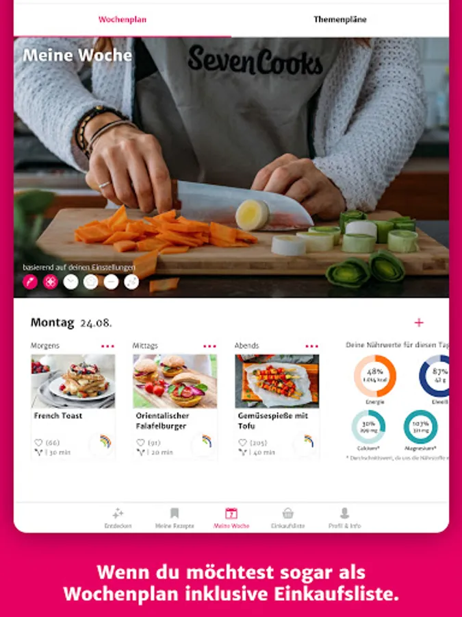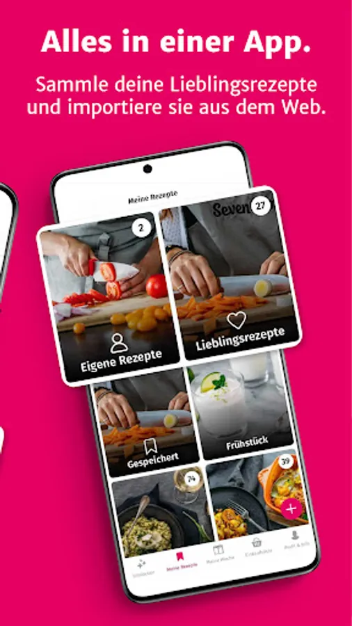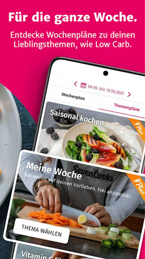 💎 Plus (€4.99 per month or €49.99 per year): all functions and content, personal weekly plans based on your preferences and settings, themed nutrition plans from the SevenCooks team, both with shopping lists, save and import recipes without limit, none advertising