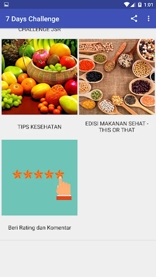 In the 7 Days Challenge application, we are taught to start Living Healthy by consuming healthy foods and drinks and also paying attention to drinking patterns and some health tips. We also don't forget to present a series of JSR menus that all friends can try.
