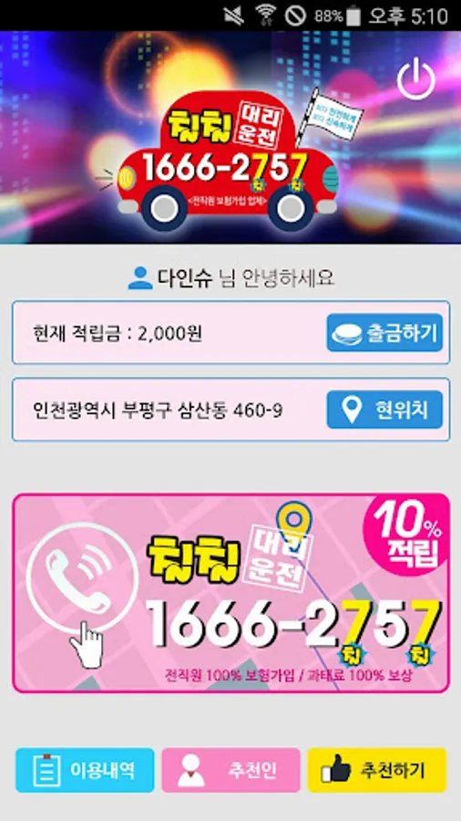 어플 다운받으시고 고객님의 적립금을실시간 바로바로 확인하시고 어플에 등록하신계좌로 입금 받으신후 대리요금 지불하세요^^