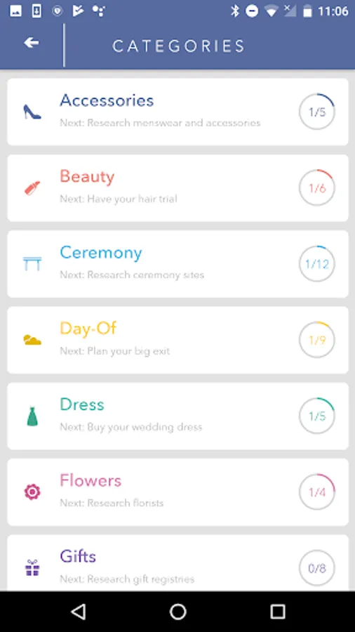 • Contacts: Put all your important wedding contacts in one place and organize them by category.