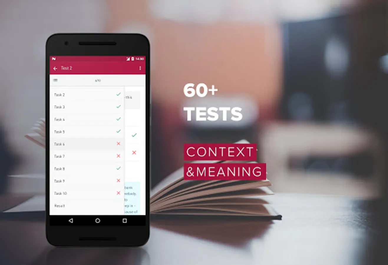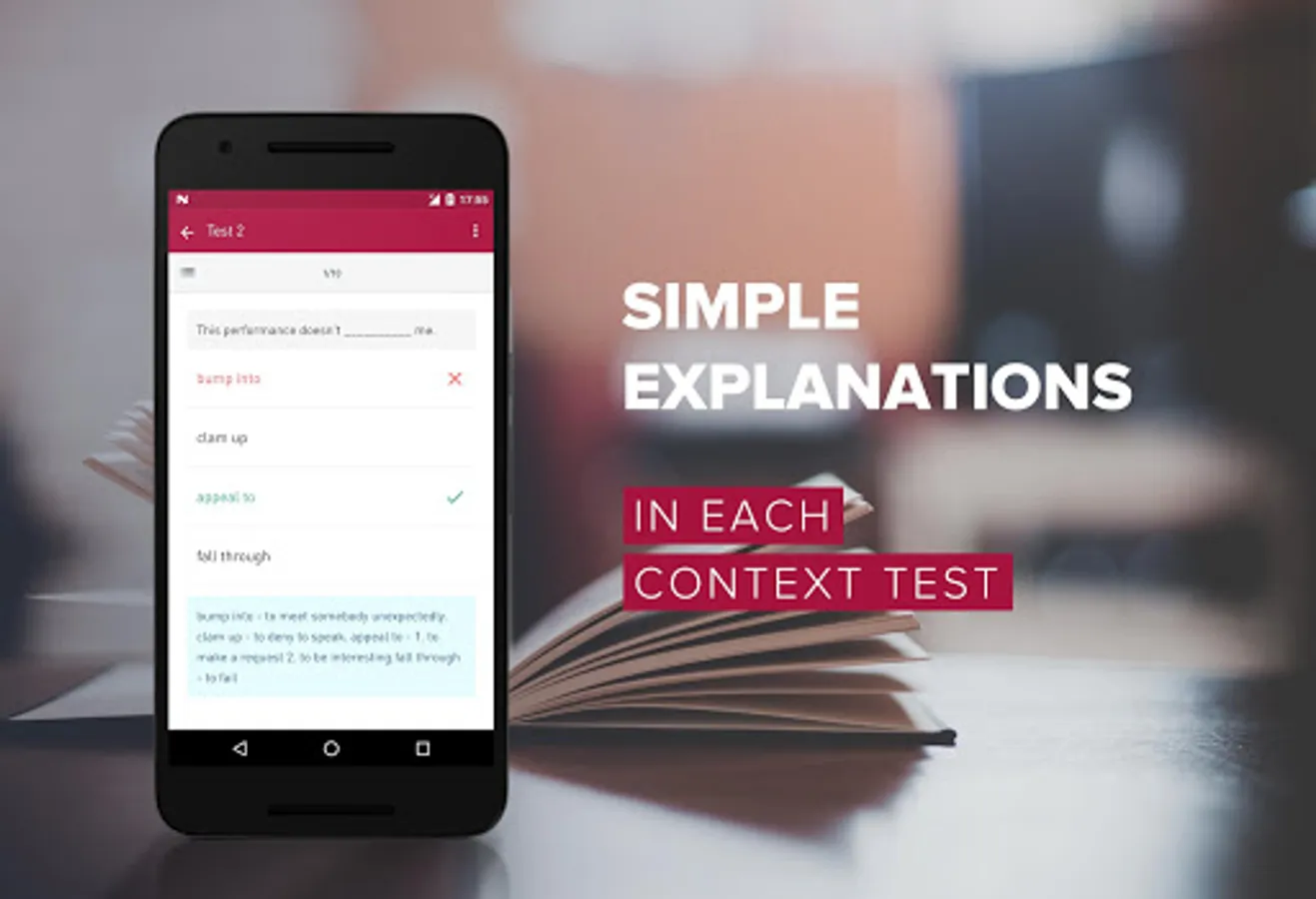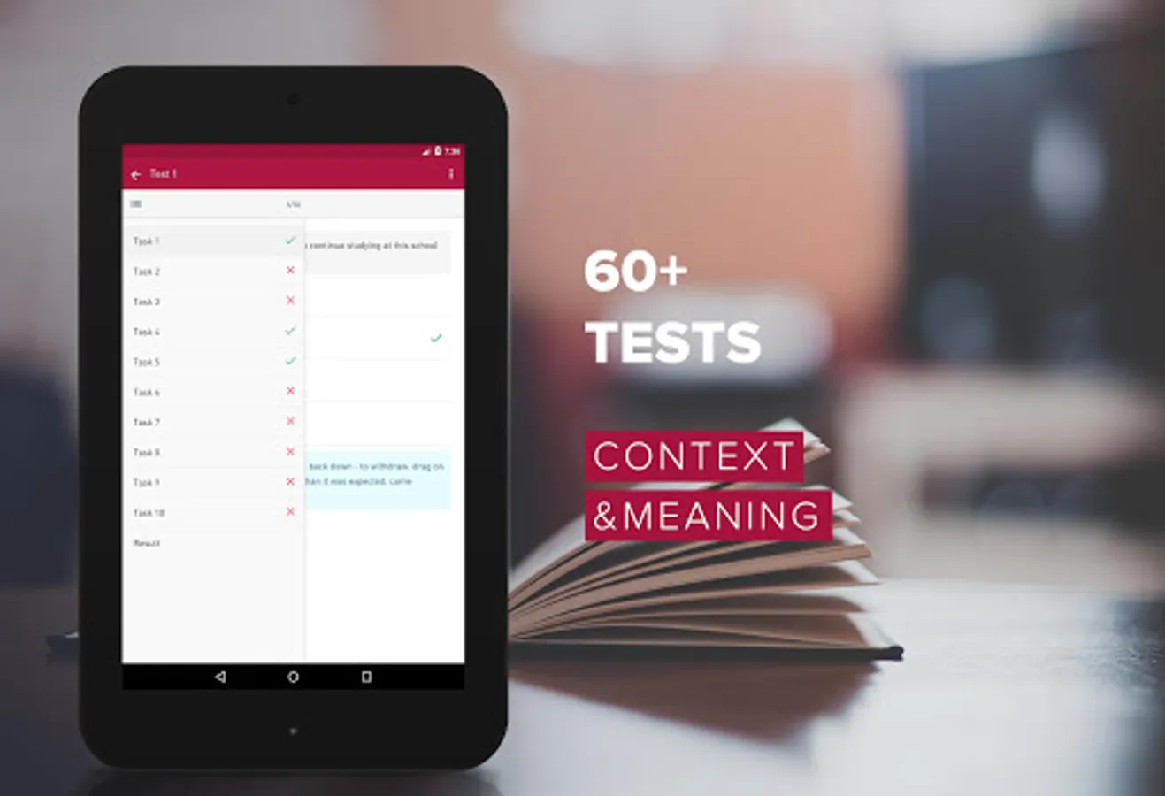 After you have studied the verbs you are able to check your knowledge. We have made up a collection of tests where users are offered to choose the needed phrasal verb or to choose the needed meaning. When you complete a test the app shows you the result and mistakes.