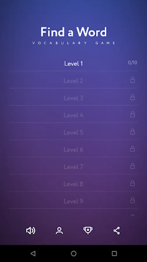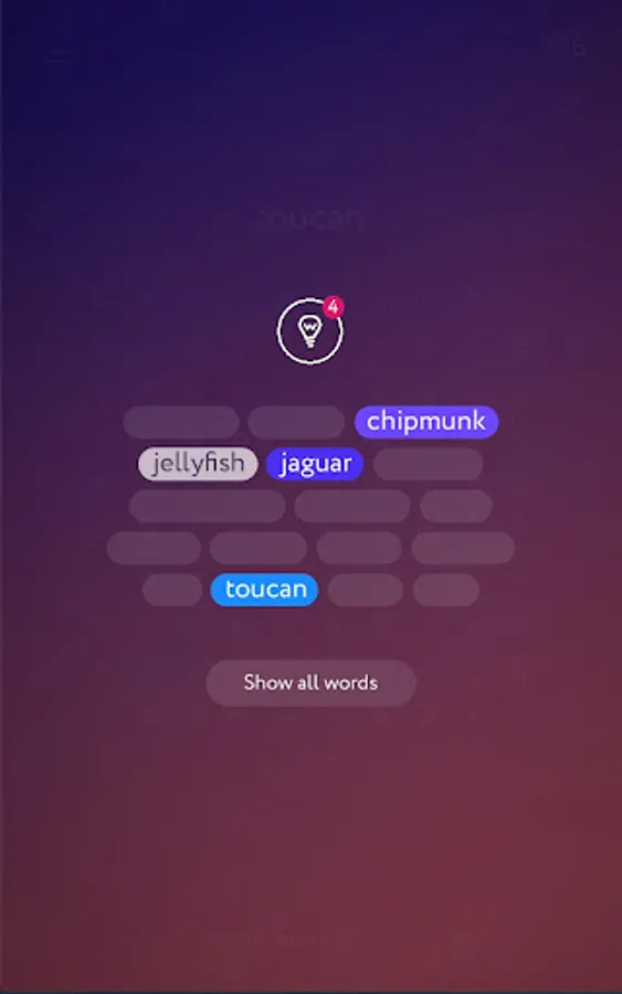The size of the squares increases as you move further in this word search game. If the first level has 3x3 squares, then the last one is 10x10. It means that the number of hidden words gets bigger. So, at first you need to find not more than 6 words, but at the last stage it is more than 20.