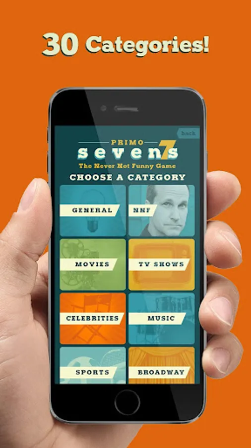 Categories include 80's Music, Action Movies, Celebrities, Broadway, Never Not Funny Trivia, Sports, Comedians, Super Heroes, Baseball, and over 20 more!!